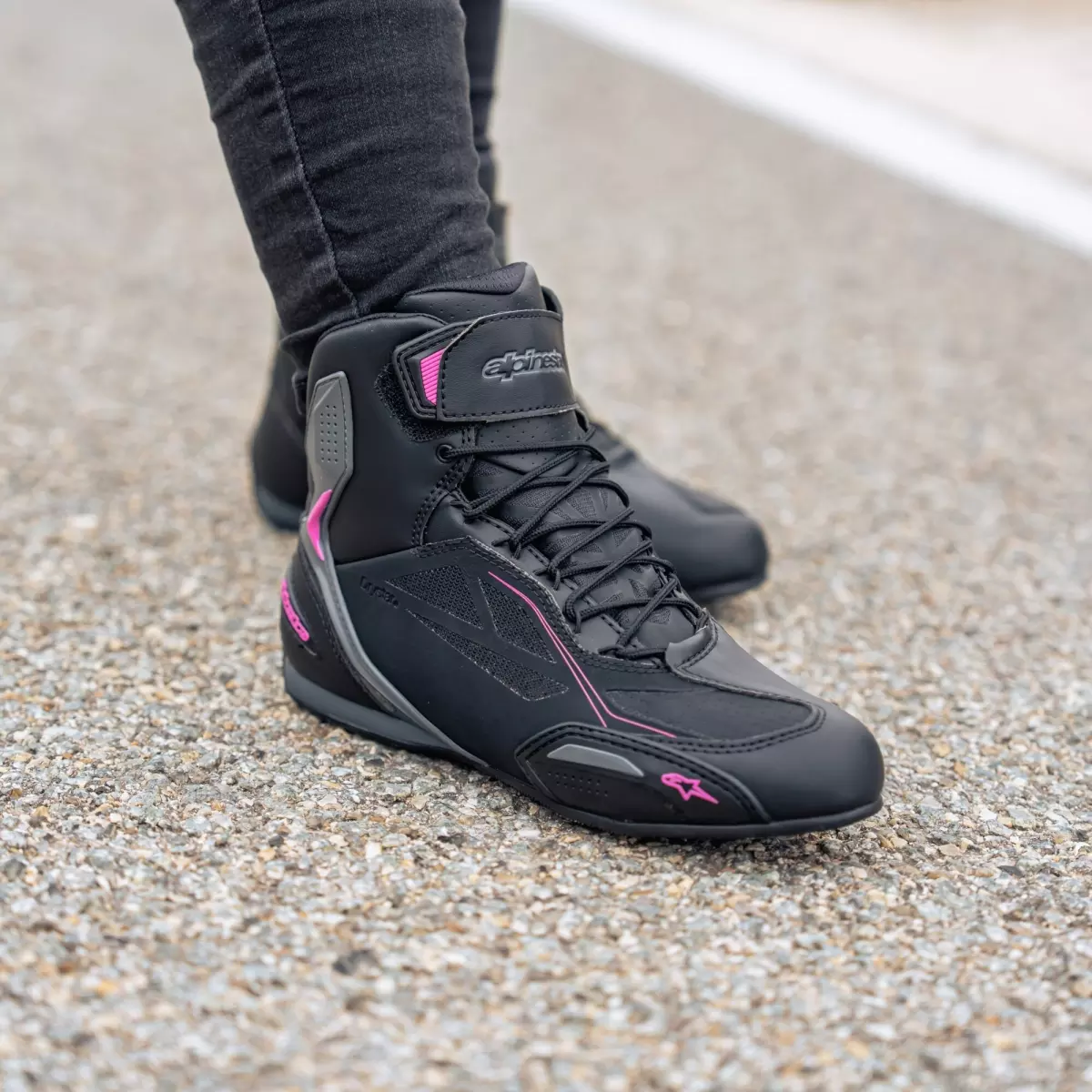 Alpinestars vous présente ses baskets pour femme, les Stella Faster 3 Drystar en coloris noir, gris et fuchsia.