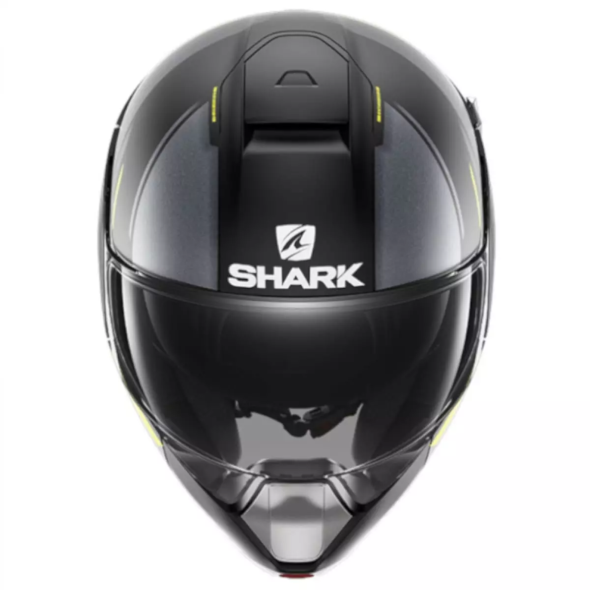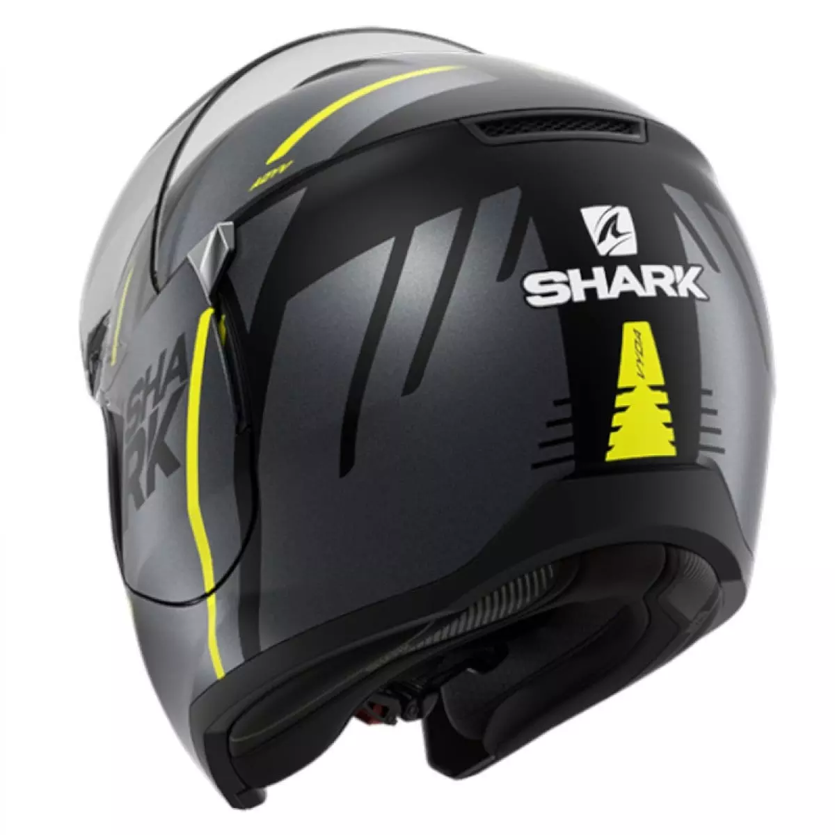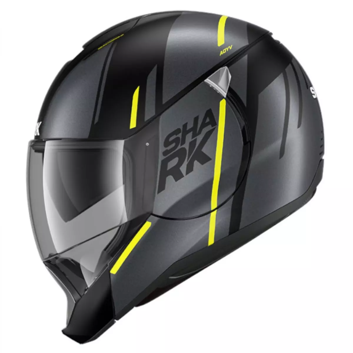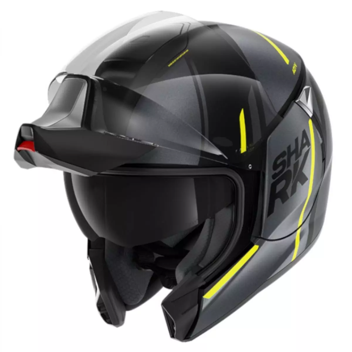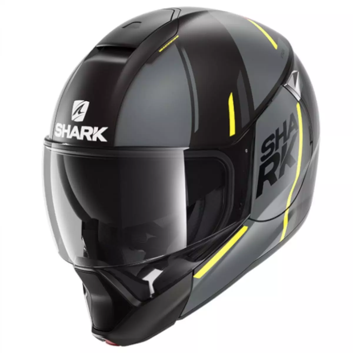 Shark nous propose son casque modulable, l'Evojet Vyda en coloris mat noir, anthracite et jaune.