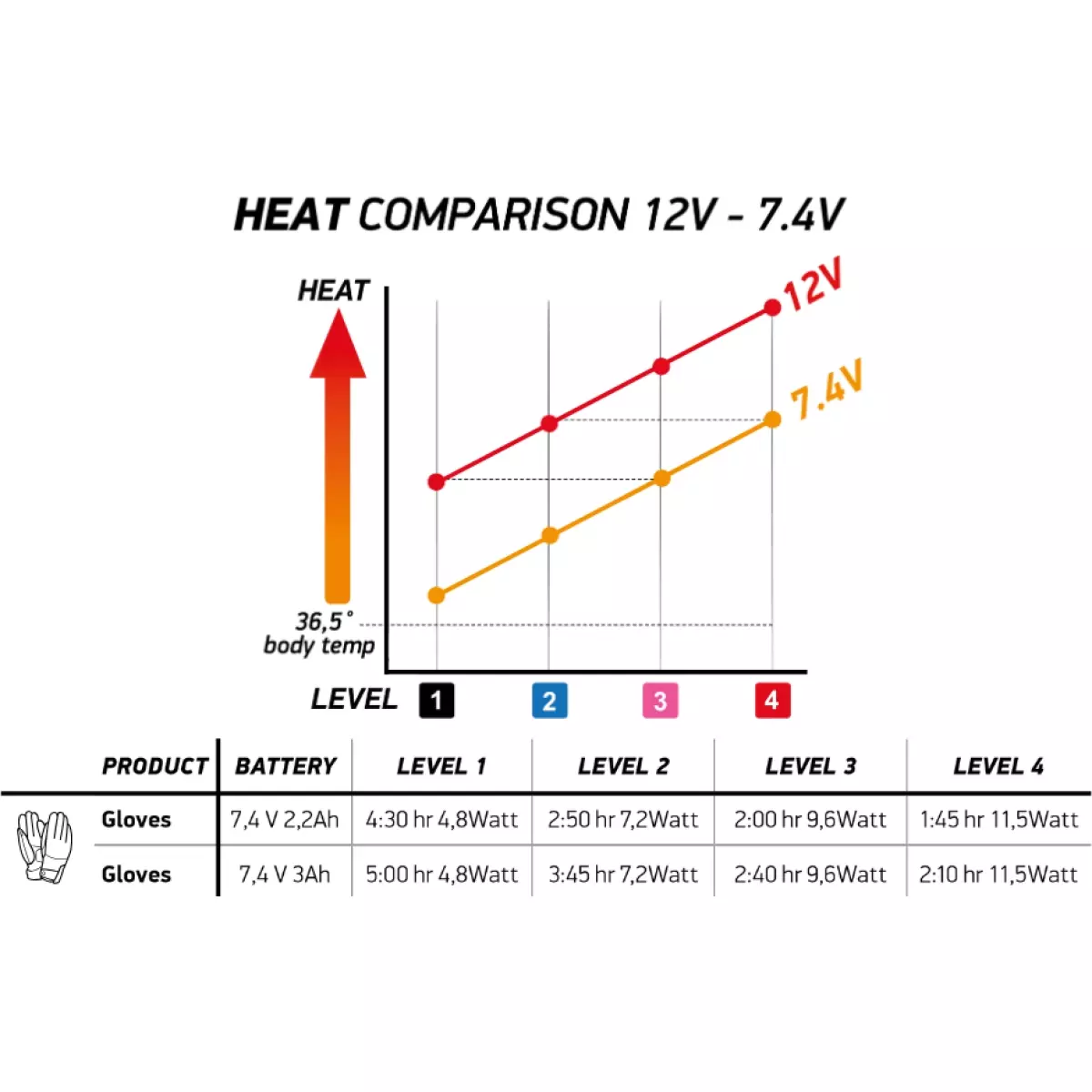 - Autonomie avec la batterie (en option) 7,4 Volts 3A (niveau 1 de chauffe) : jusqu'à 5H