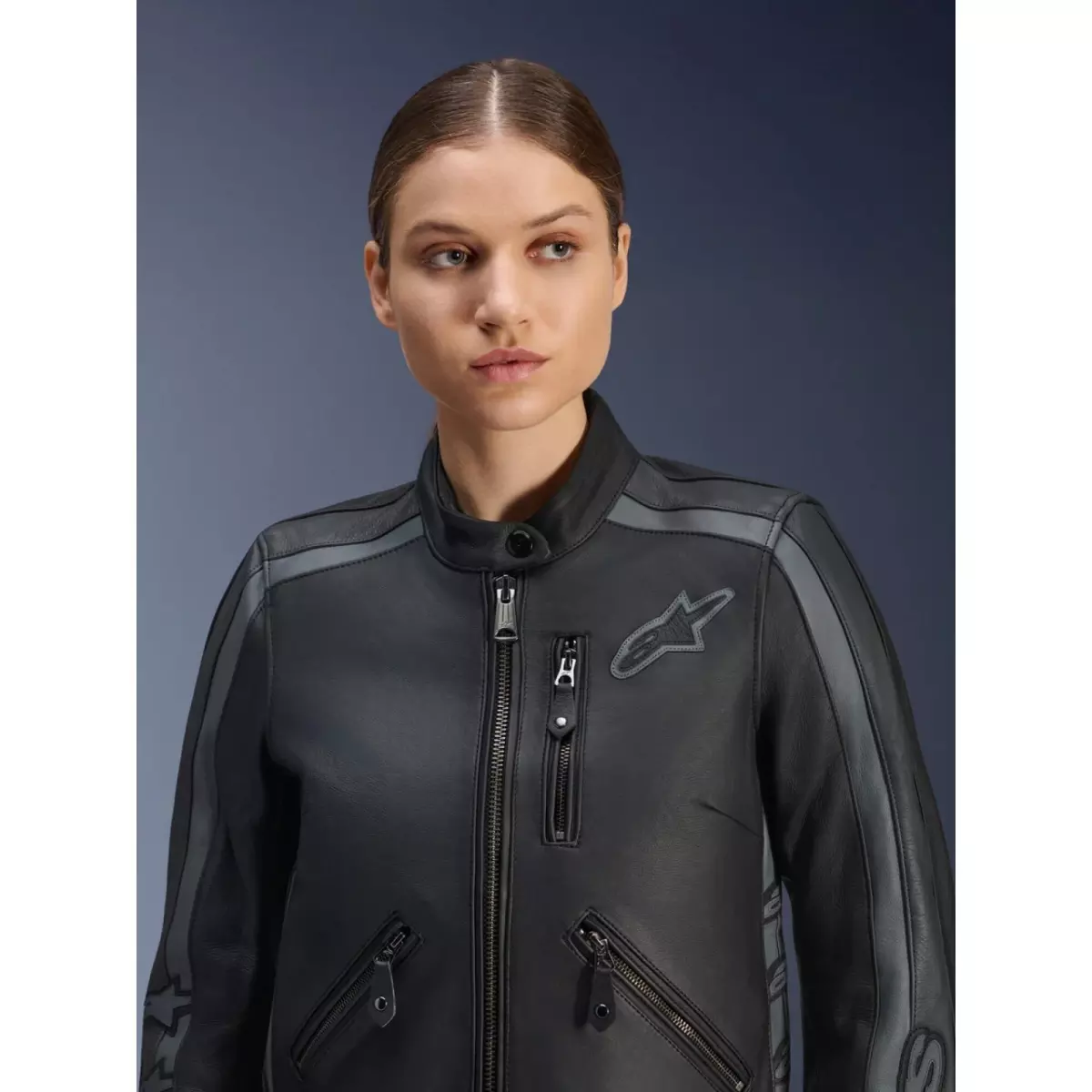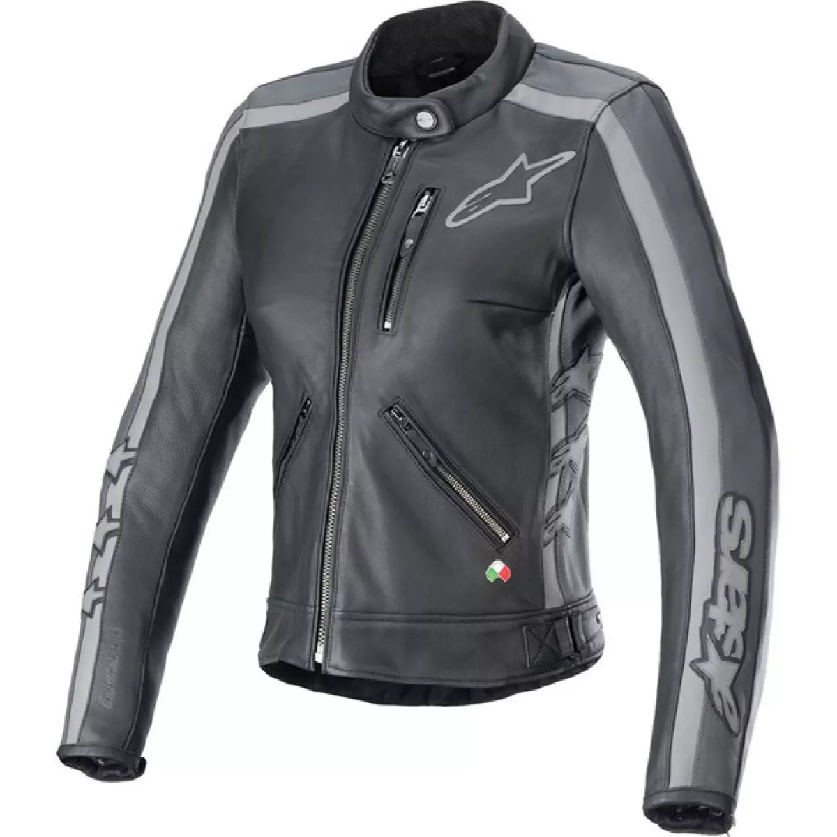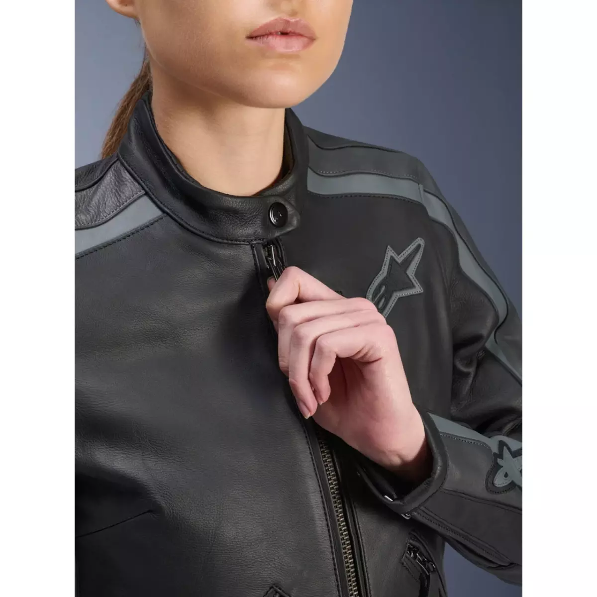 Alpinestars vous présente son blouson moto en cuir pour femme, le Stella Dyno en coloris noir et gris.