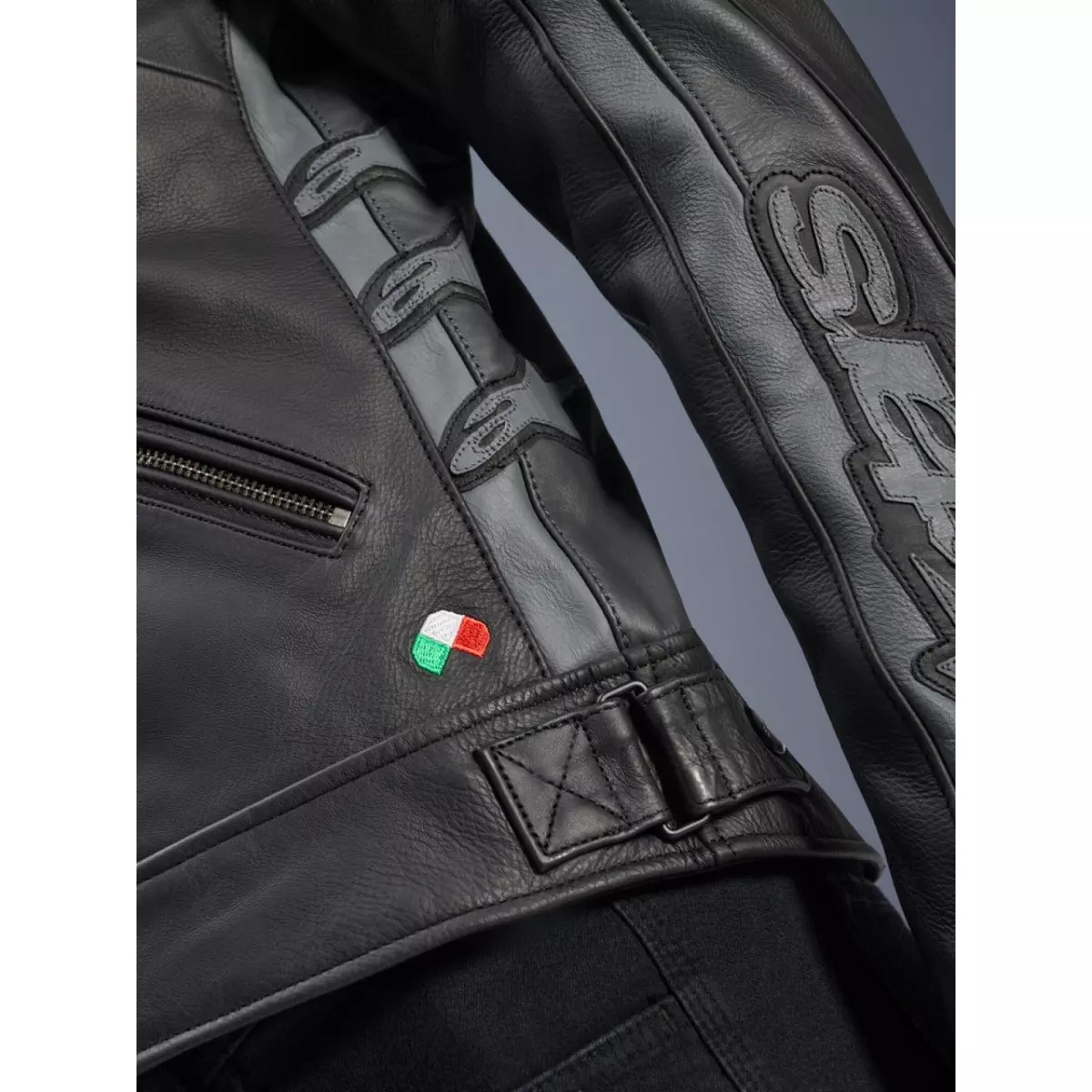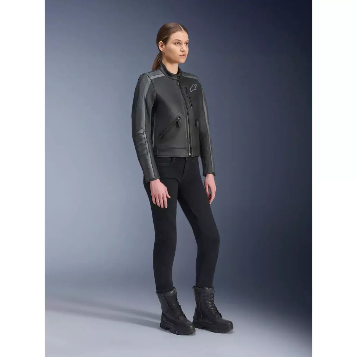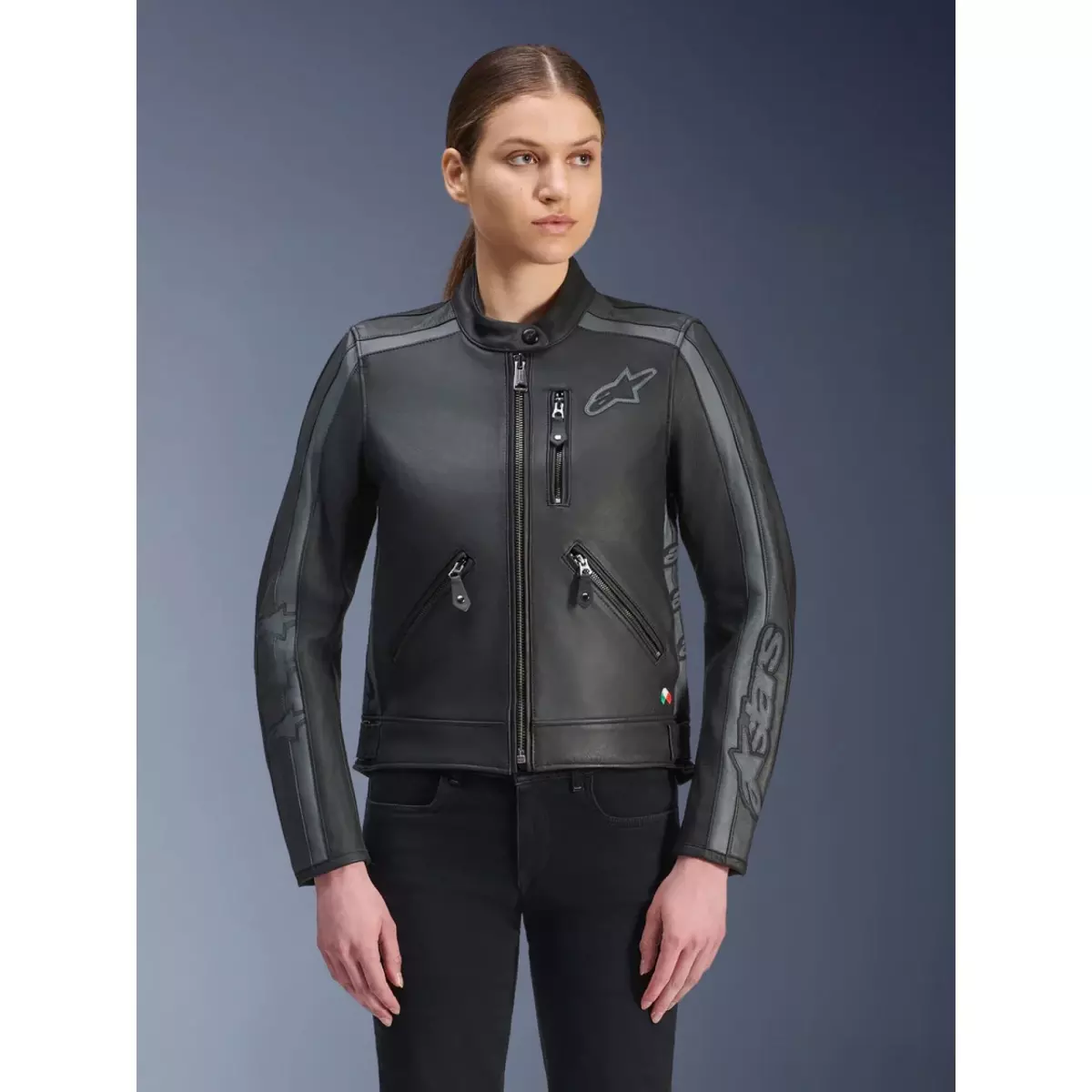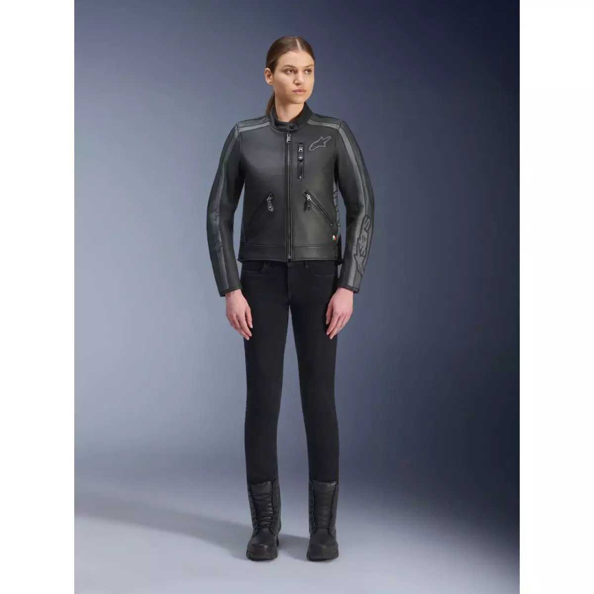 Alpinestars vous présente son blouson moto en cuir pour femme, le Stella Dyno en coloris noir et gris.