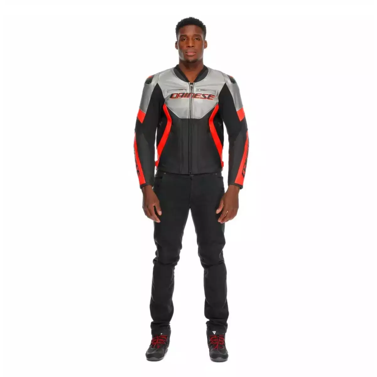 Dainese vous présente sa veste pour homme, la Racing 5 en coloris silver, noir et rouge fluo.
