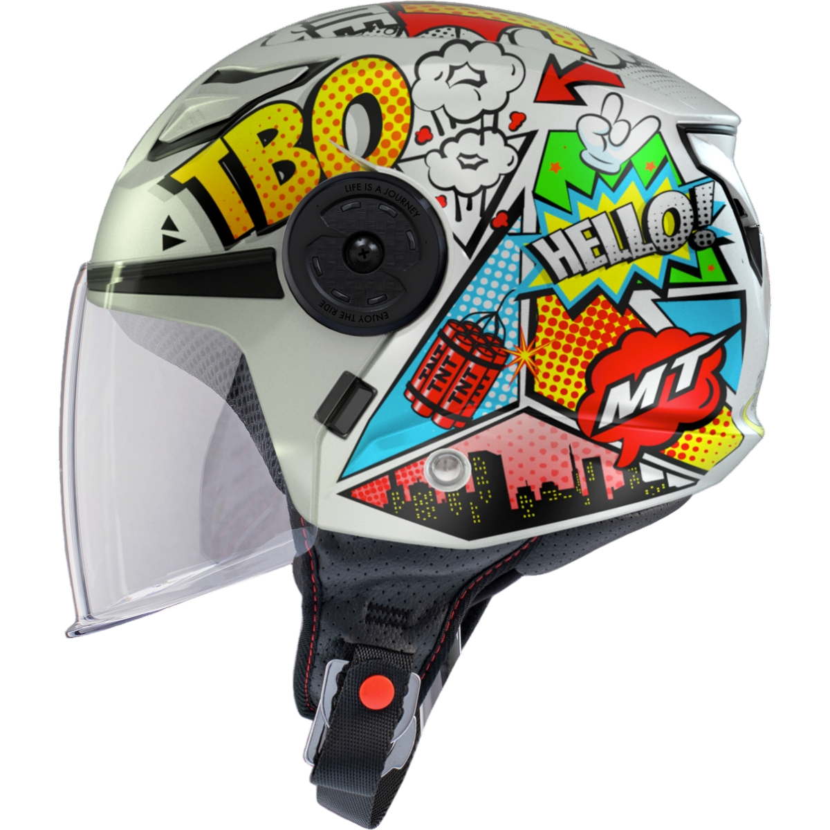 MT Helmets vous présente son casque jet pour enfant, le Lite Kid TBO A0 en coloris blanc et multicolore.