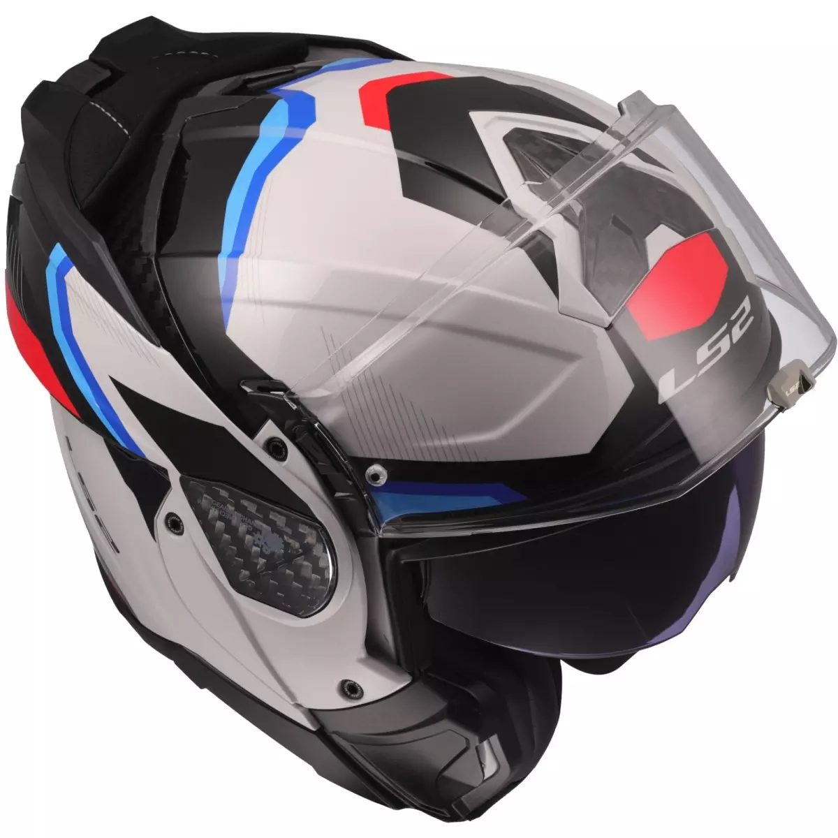 LS2 vous présente son casque moto modulable, le FF910 Advant II Triple en coloris blanc, bleu et rouge.