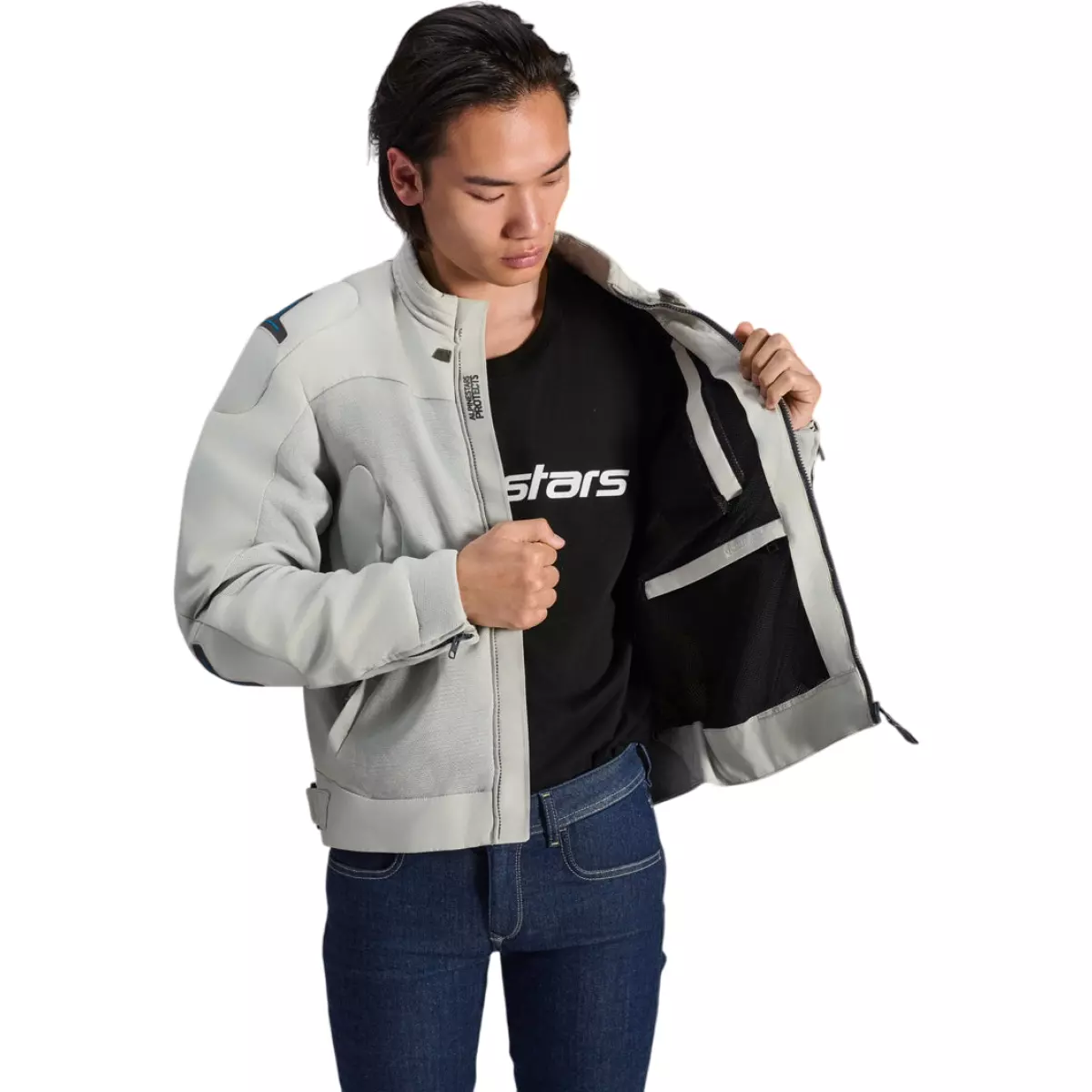 Alpinestars nous propose sa veste, la Circal-1 Air en coloris gris métal et bleu.