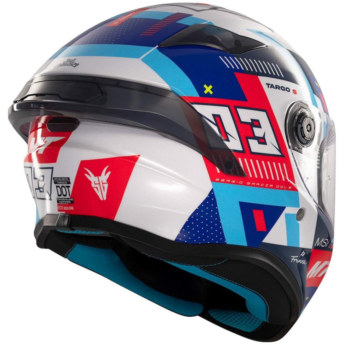 MT Helmets vous présente son casque intégral, le Targo S Sergio Garcia 2024 D7 en coloris blanc, bleu et rouge brillant.