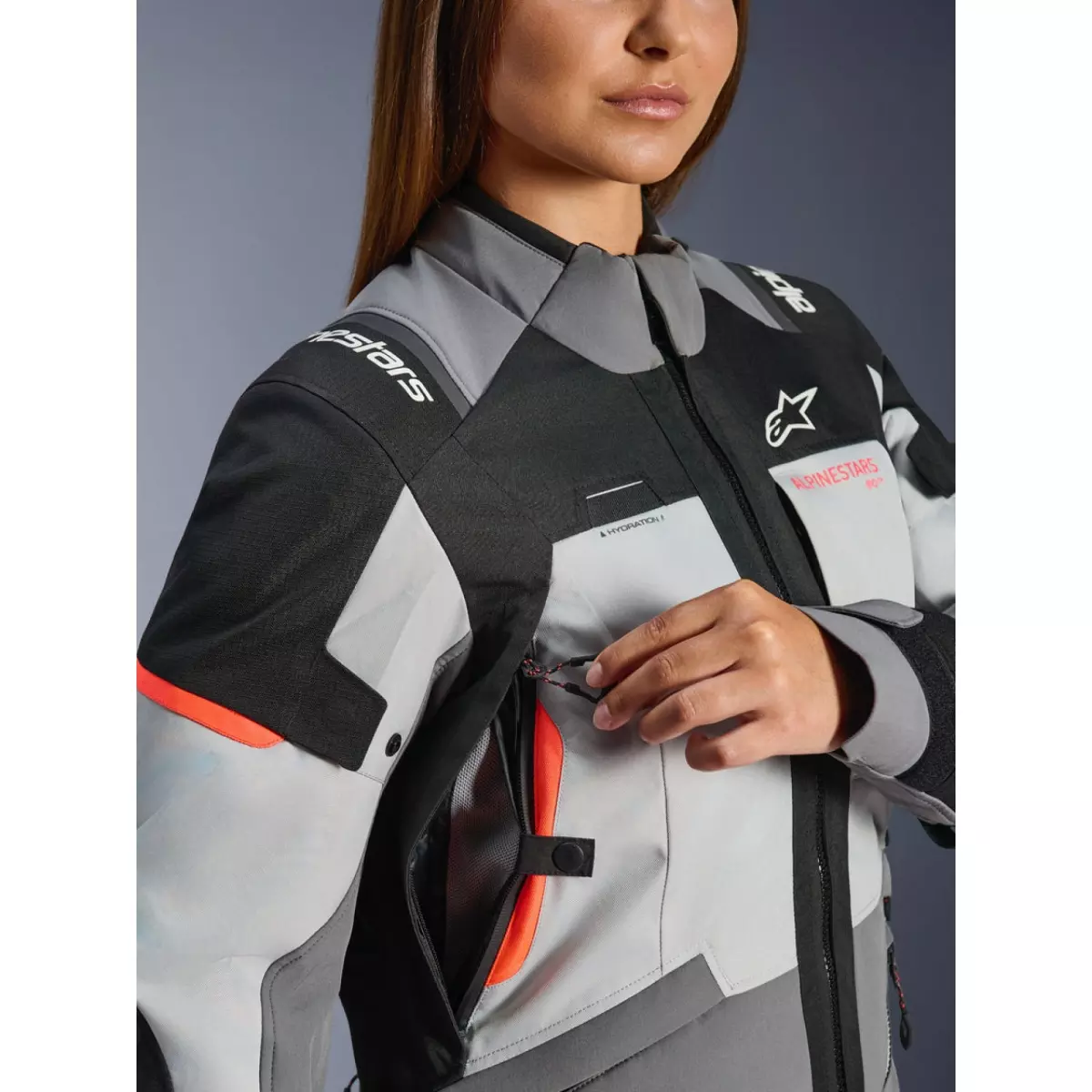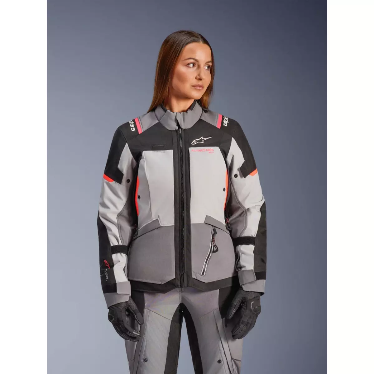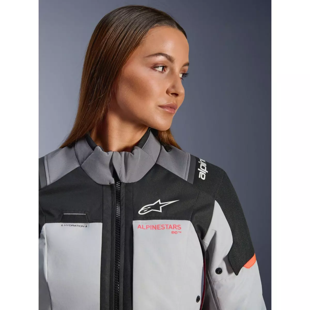 Alpinestars vous présente son veste moto pour femme, la Stella Andes V4 Drystar en coloris gris foncé, gris clair et corail fluo.