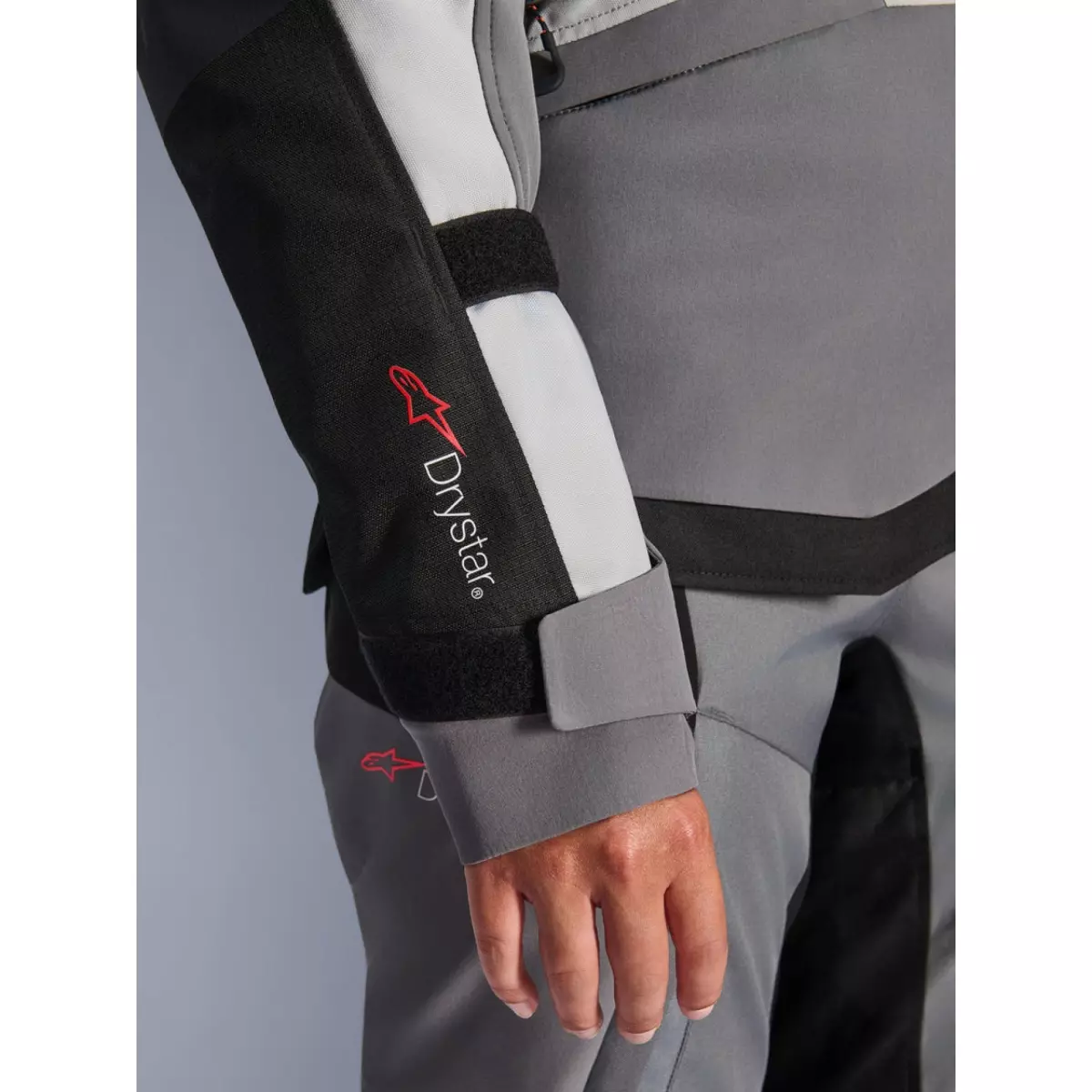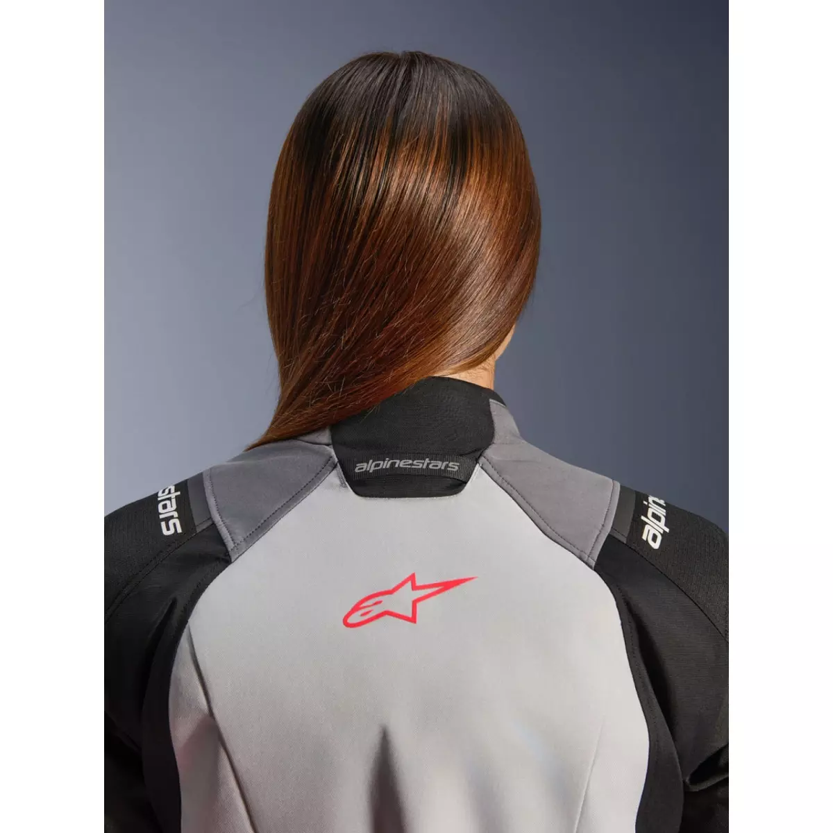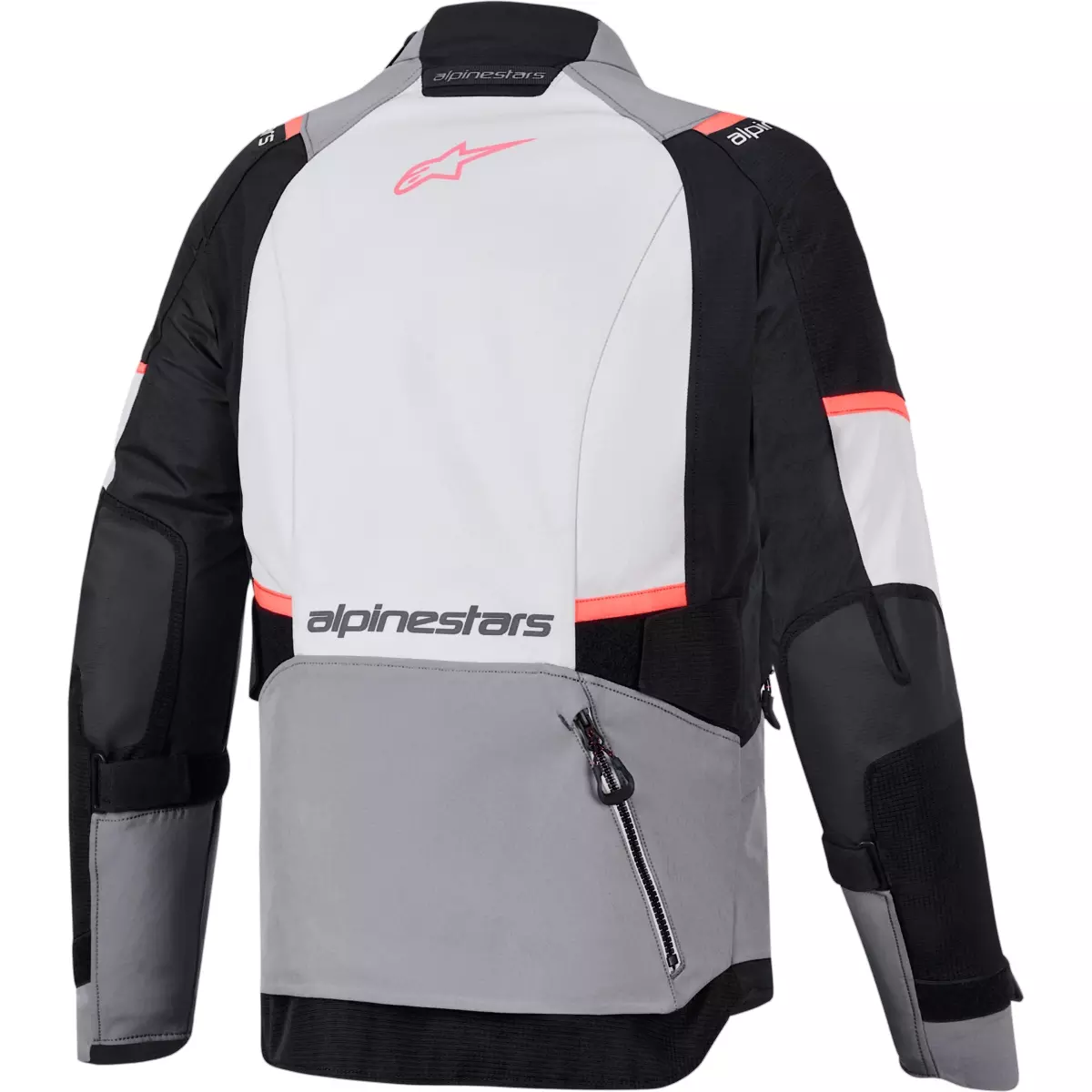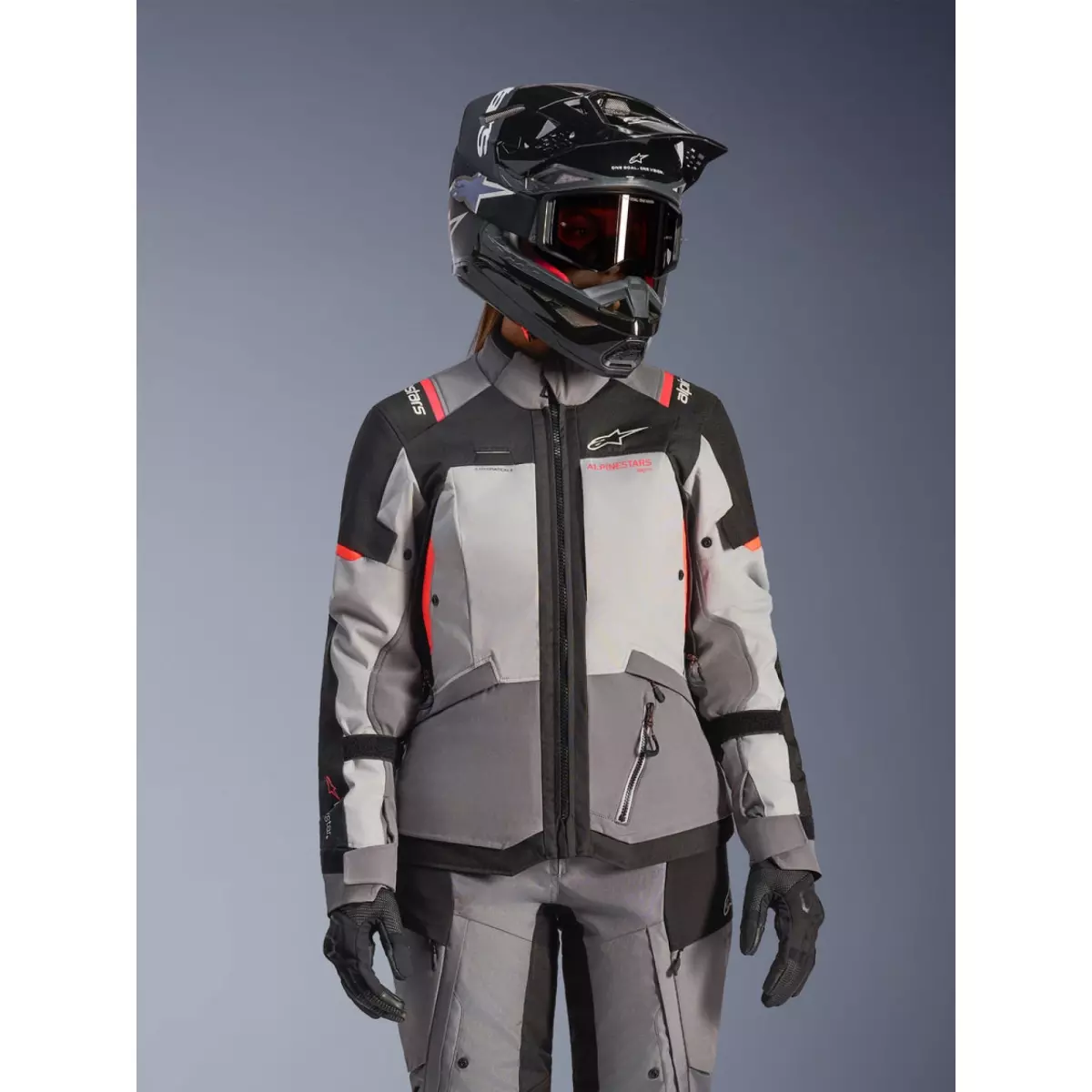 Alpinestars vous présente son veste moto pour femme, la Stella Andes V4 Drystar en coloris gris foncé, gris clair et corail fluo.