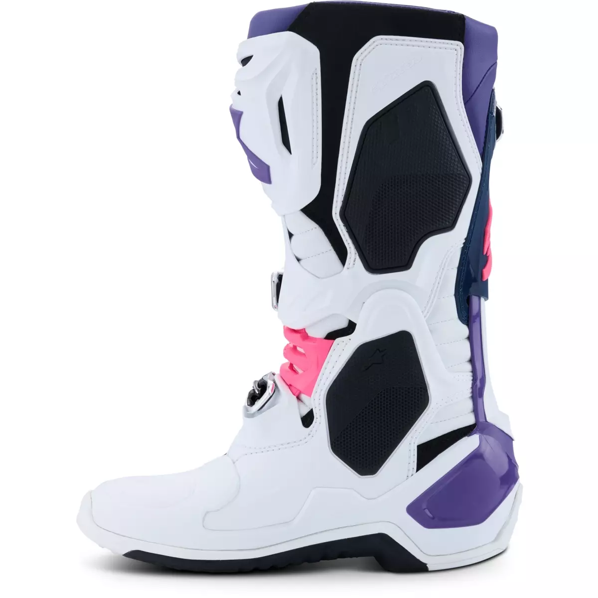Alpinestars vous présente ses bottes cross, les Tech 10 en coloris blanc, violet, bleu marine et rose fluo.