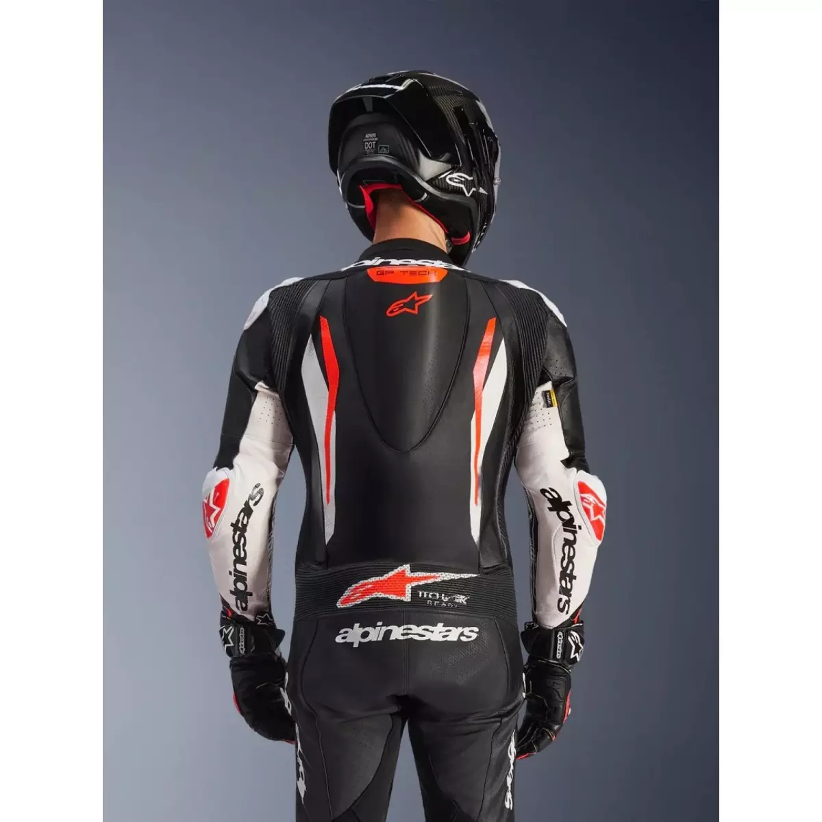 Alpinestars vous présente sa combinaison 1 pièce, la GP Tech V5 en coloris noir, blanc et rouge fluo.