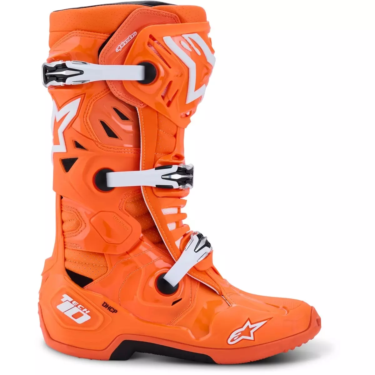 Alpinestars vous présente ses bottes cross, les Tech 10 Supervented en coloris orange fluo, noir et blanc.