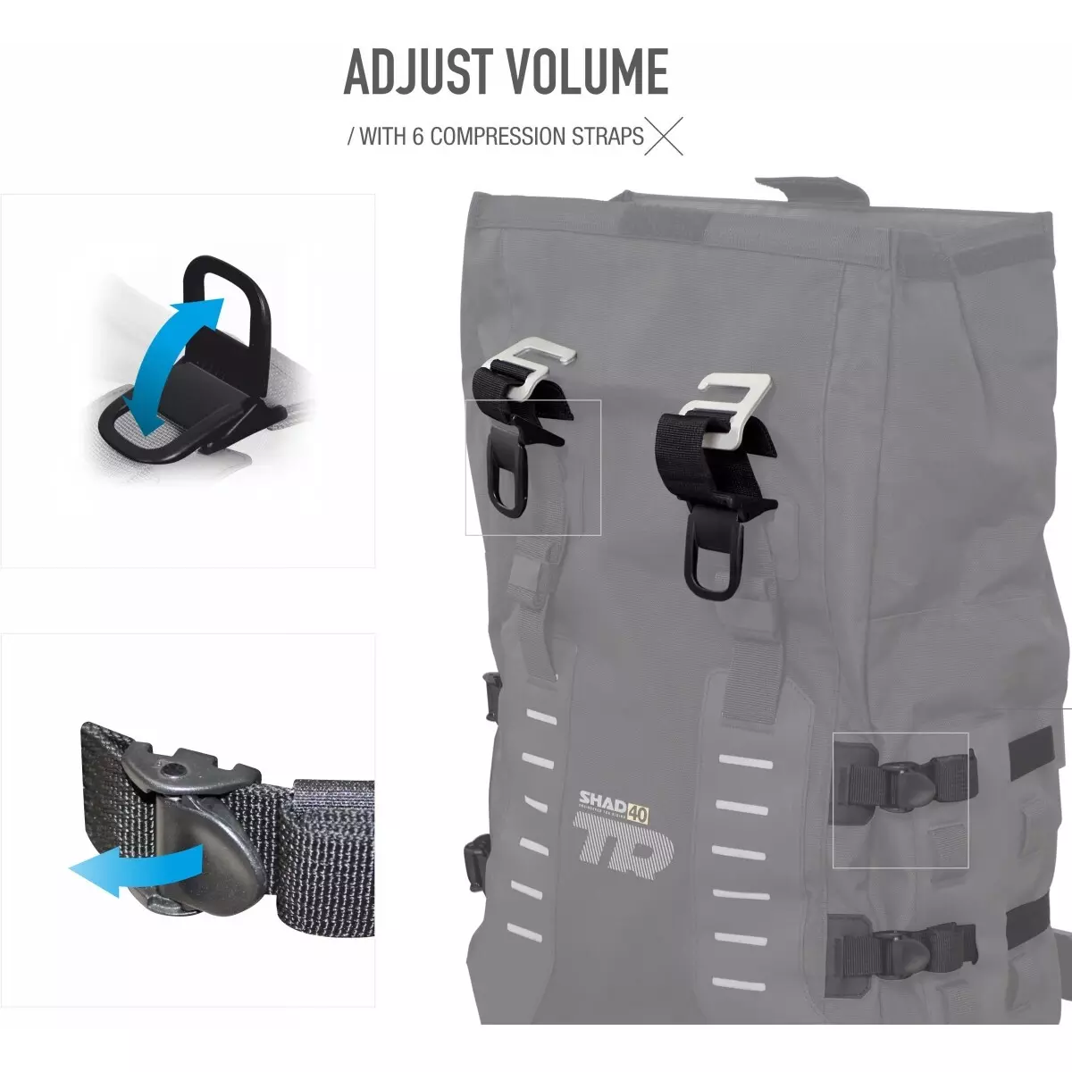 - 6 boucles Duraflex pour ajuster le sac au volume de la charge et améliorer la stabilité