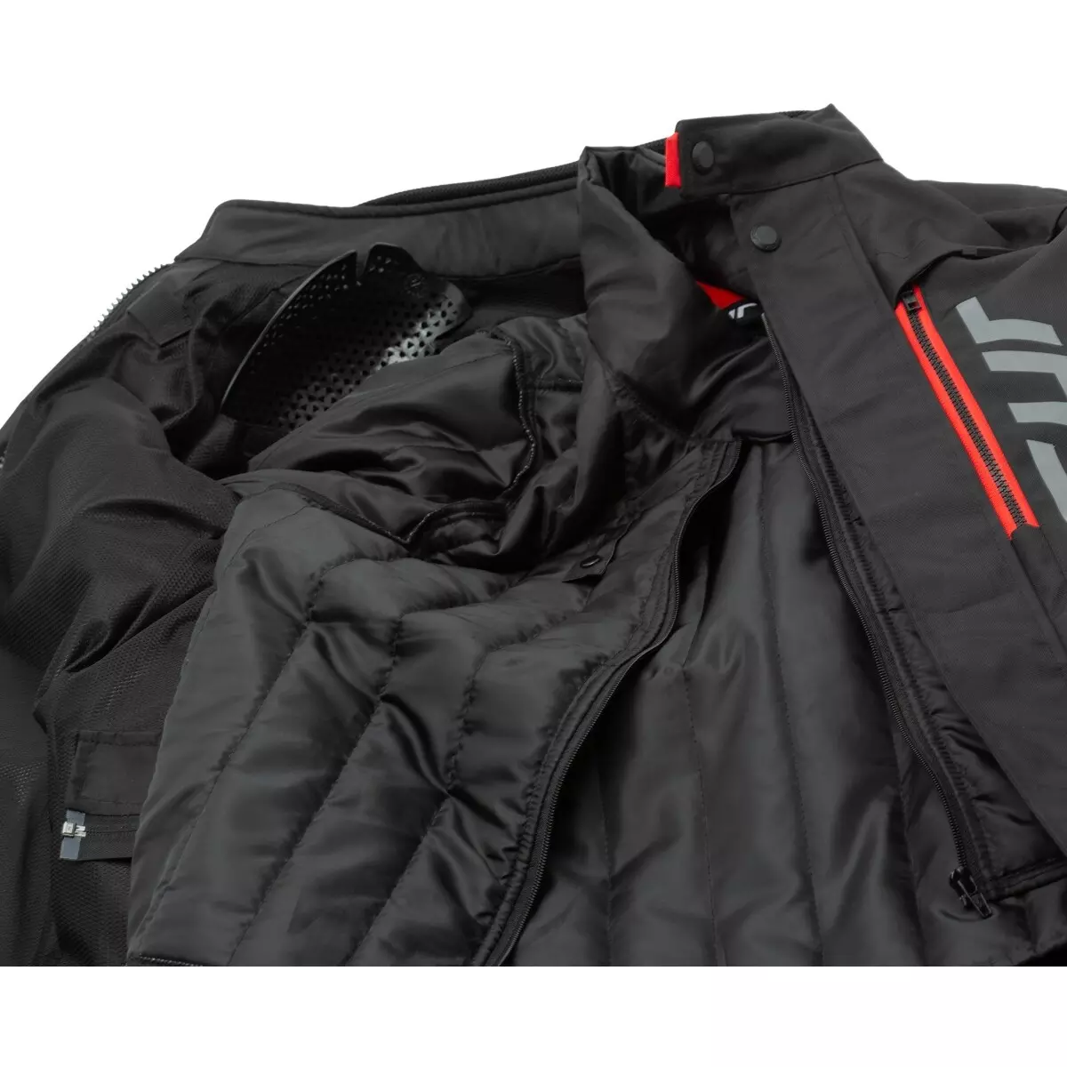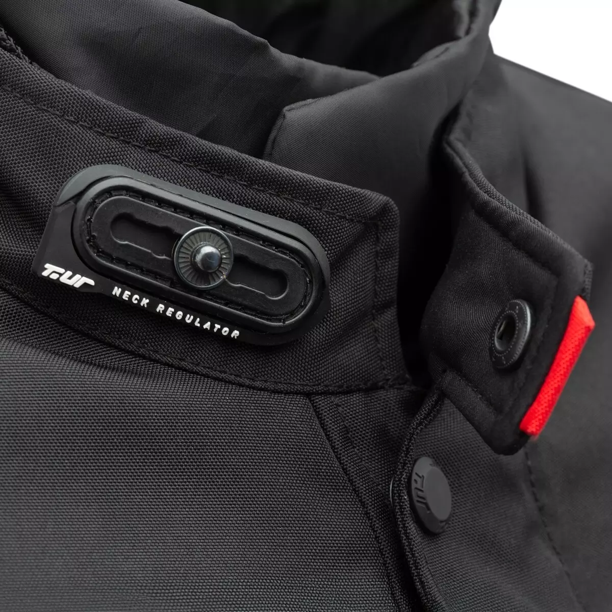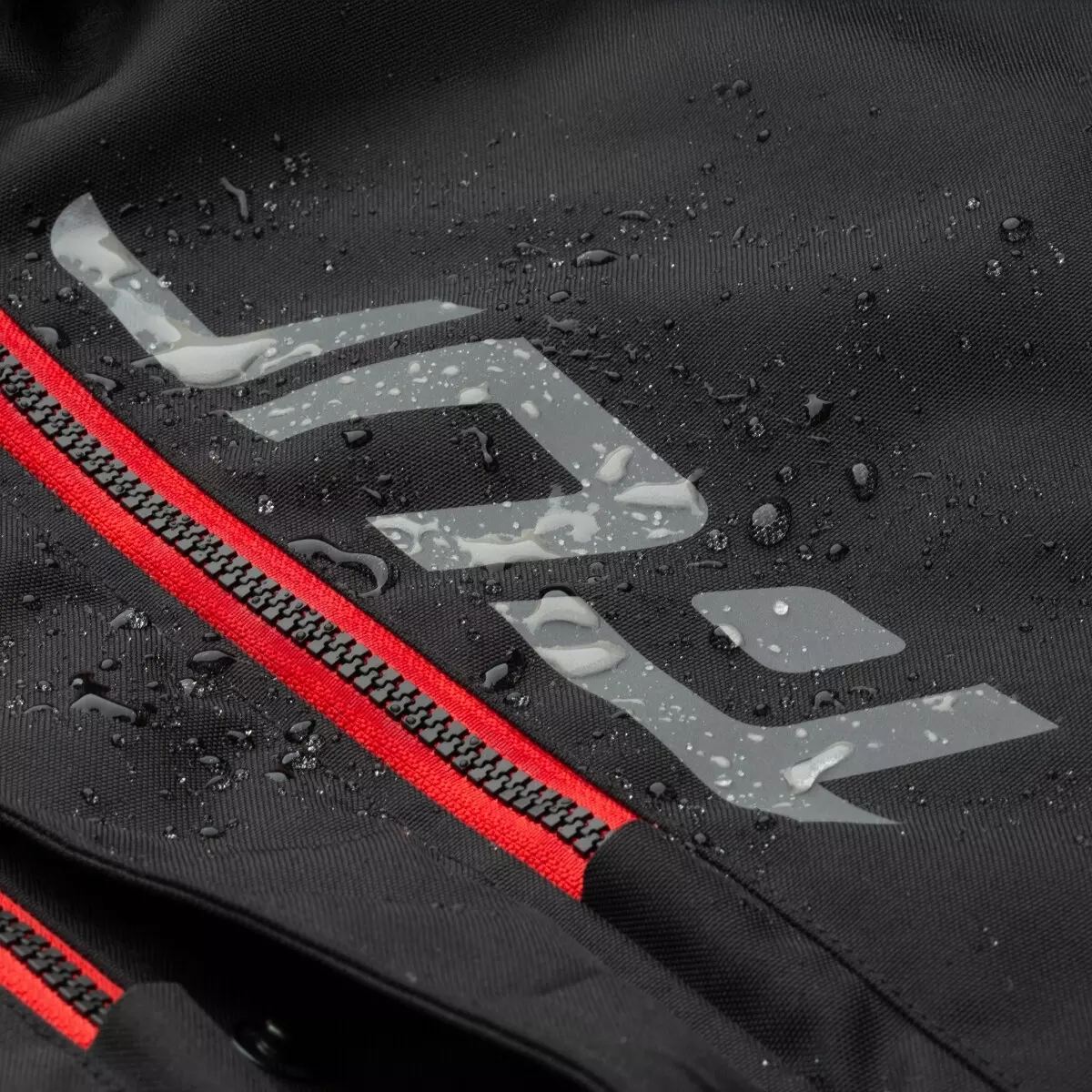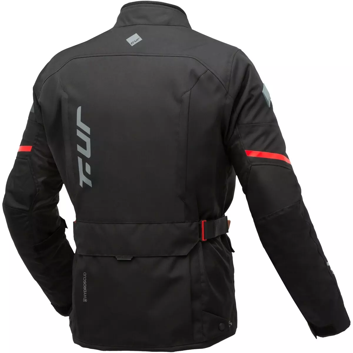 T.UR vous présente sa veste moto, la Canyon Hydroscud en coloris noir et rouge.