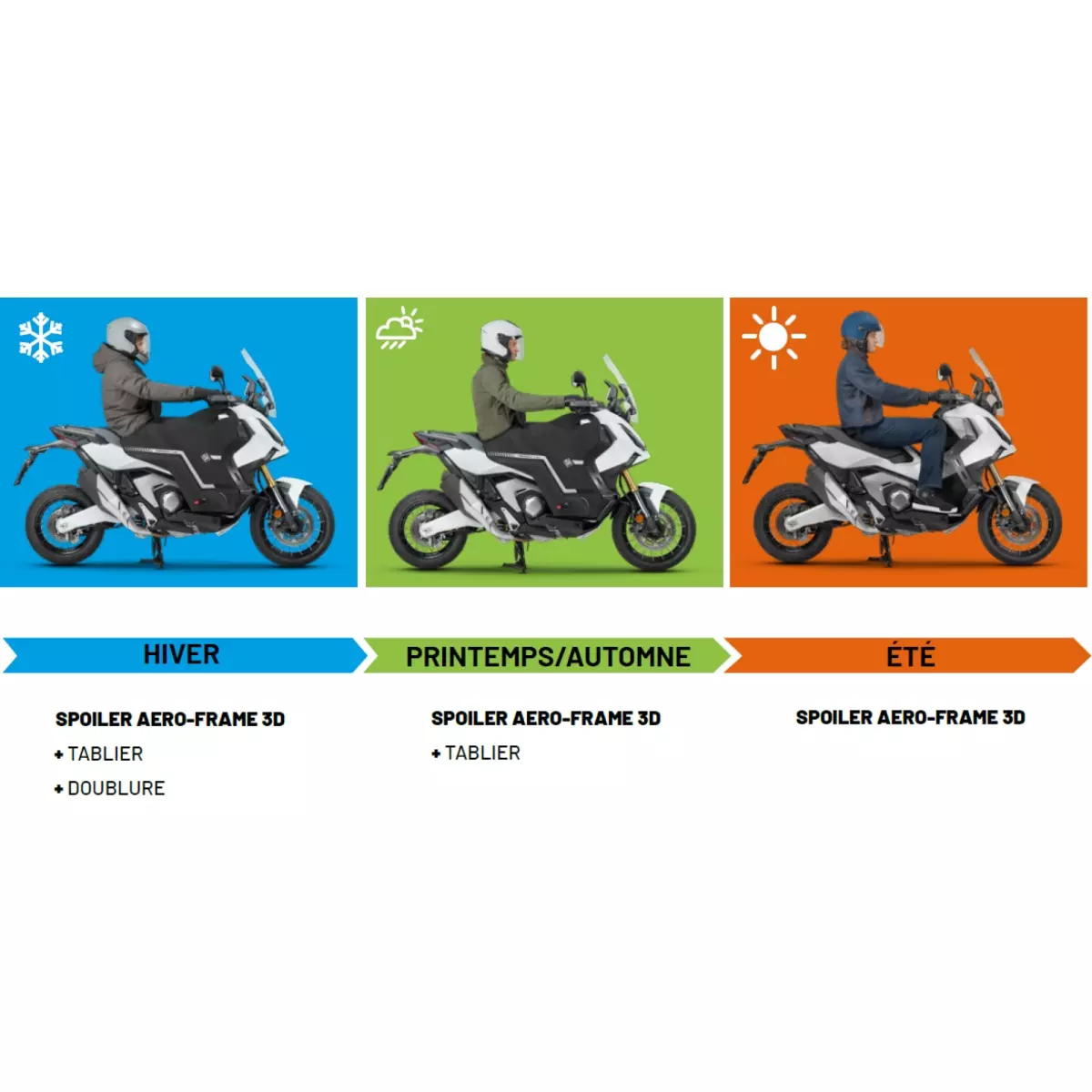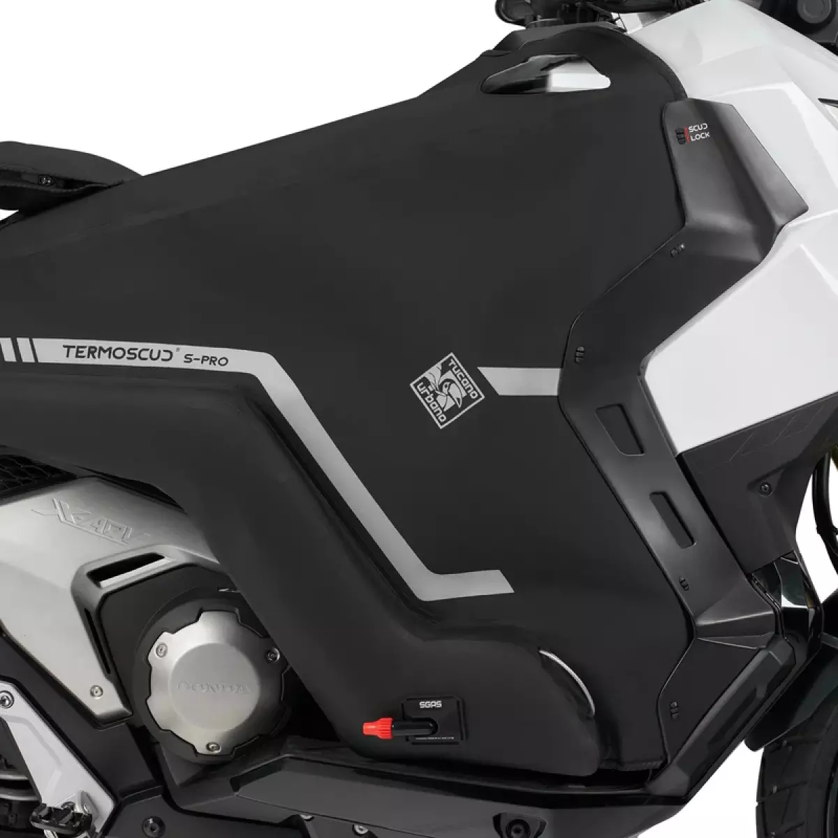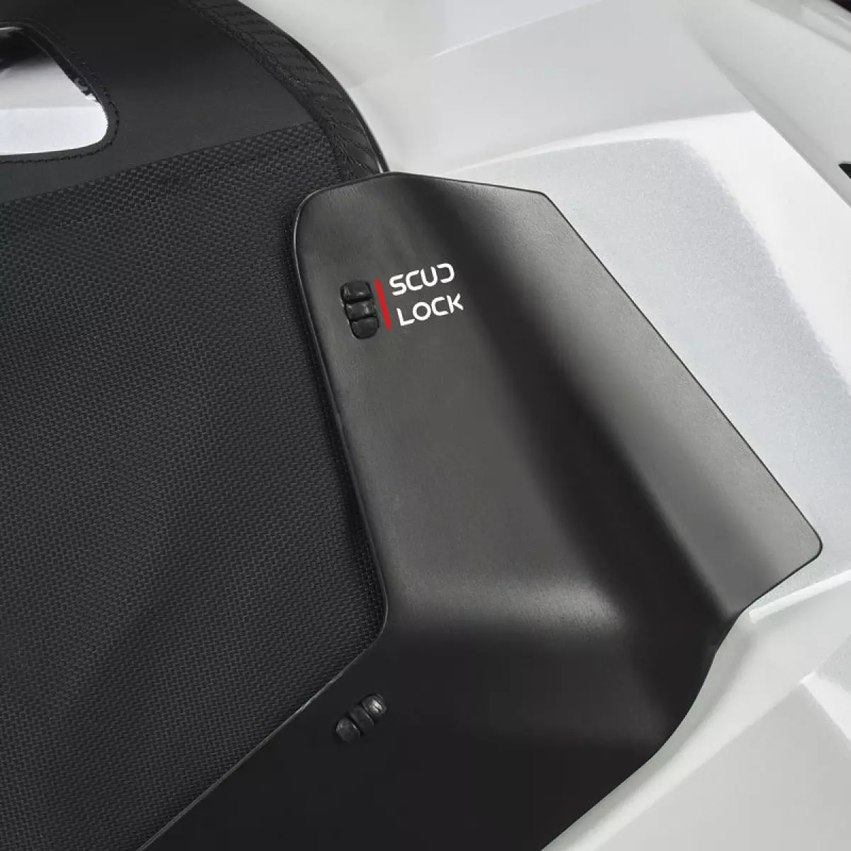 Dernier né de la gamme Termoscud® PRO, ce tablier est équipé du nouveau système Scudlock. Il allie élégance et simplicité d’utilisation : après installation du Spoiler Aero-Frame 3D à l’aide des vis et des adhésifs 3M™ VHB™ fournis, il suffit de clipser le tablier sur le spoiler pour que l’ensemble s’intègre parfaitement, offrant ainsi une protection optimale contre les intempéries tout au long de l’année. Autre avantage : une housse extractible intégrée protège la selle en cas de besoin.