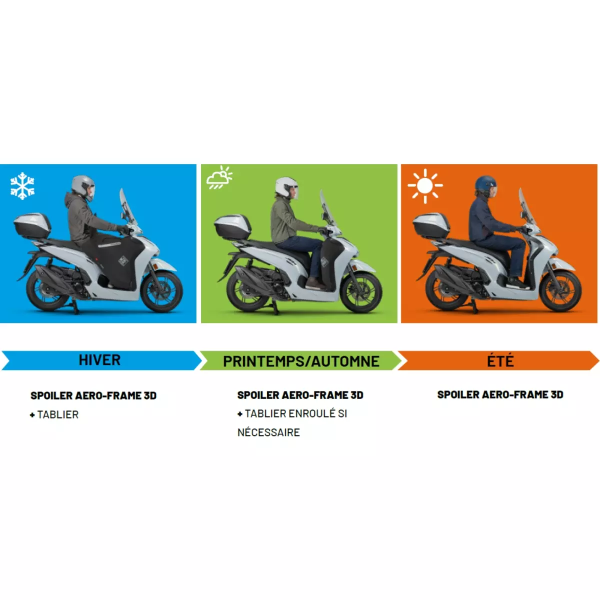 Grâce au 4 Season System, une technologie offrant une grande modularité du tablier, enroulez-le au besoin pour minimiser l’encombrement. En mode « été », seuls les spoilers restent visibles, préservant ainsi l’esthétique de l’ensemble. Pour une protection complète, pensez à ajouter une paire de manchons (disponibles dans notre rubrique « Manchons moto et scooter »).