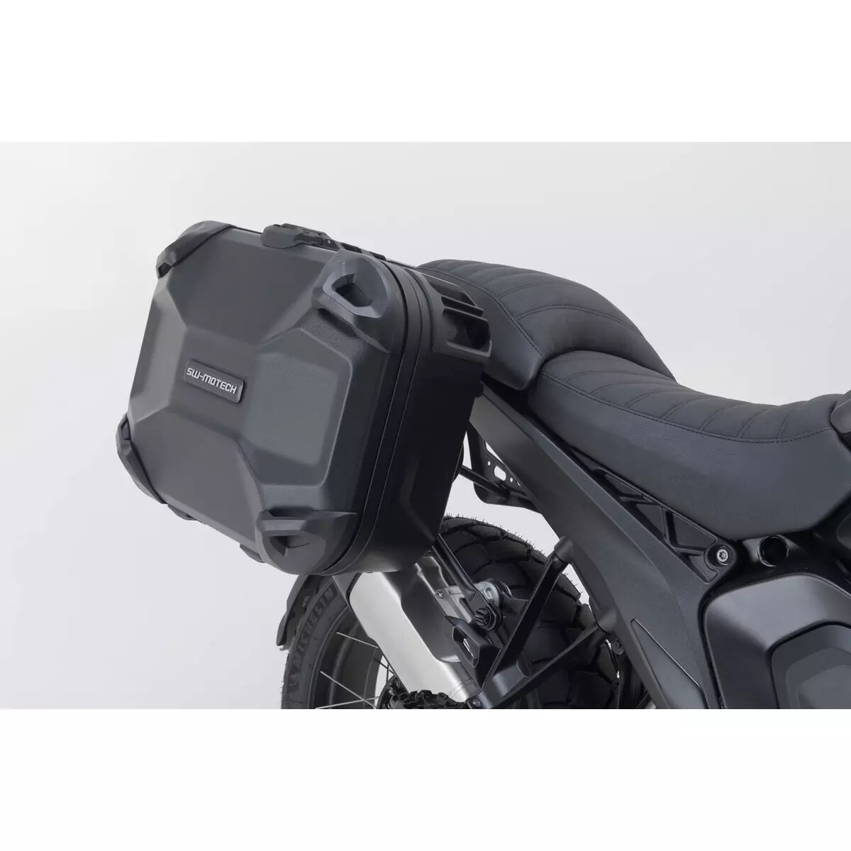 Les valises sont conçues en ABS thermoformé de 3 mm d’épaisseur : robustes, légères et totalement étanches à l’eau et à la poussière. Elles se fixent solidement sur leurs supports : une platine Adventure-Rack en aluminium et des supports PRO en acier, eux-mêmes ancrés aux points de fixation d’origine de la moto. Cette conception garantit un voyage en toute sérénité, quel que soit le type de trajet. Les valises, utilisables également comme top-case, épousent parfaitement la géométrie de la moto.