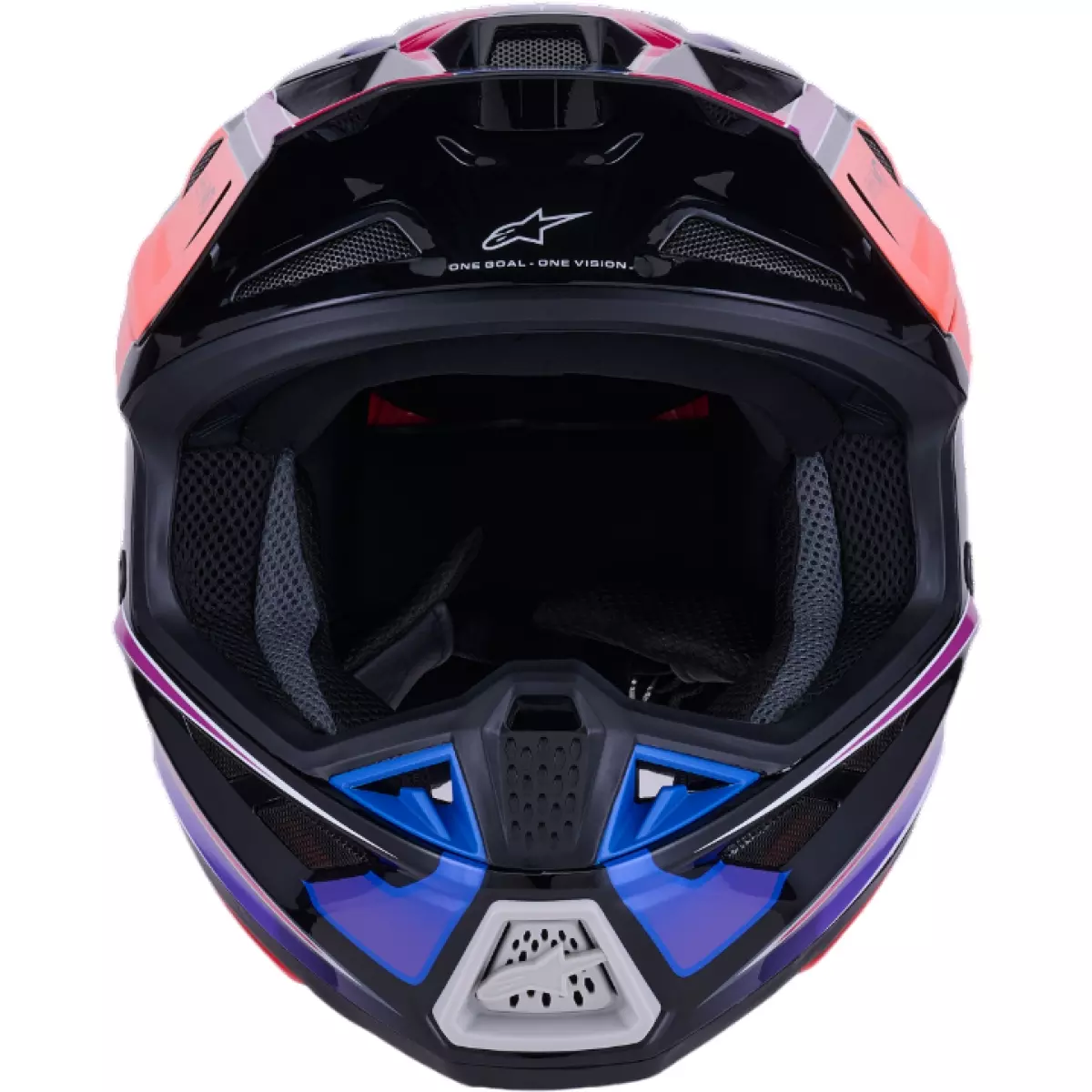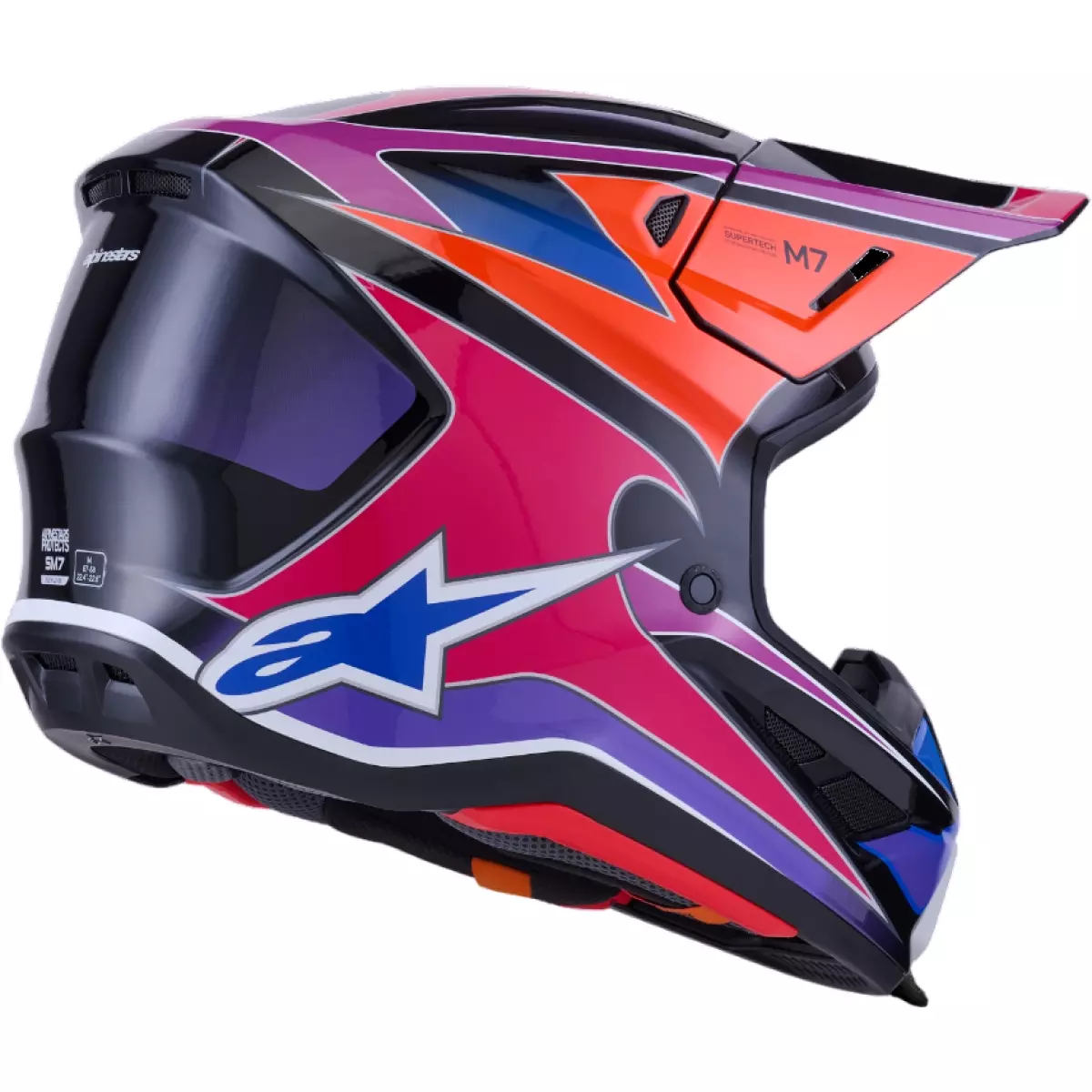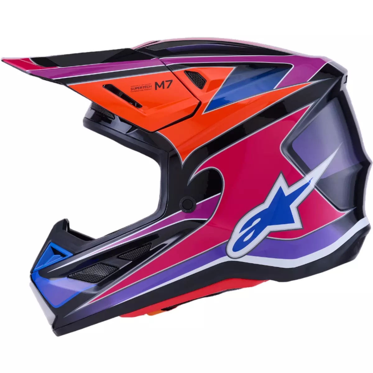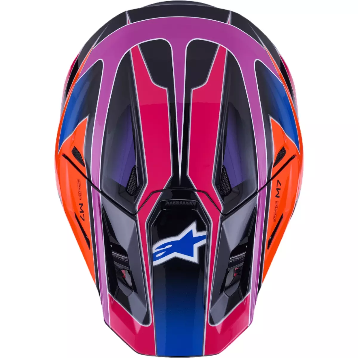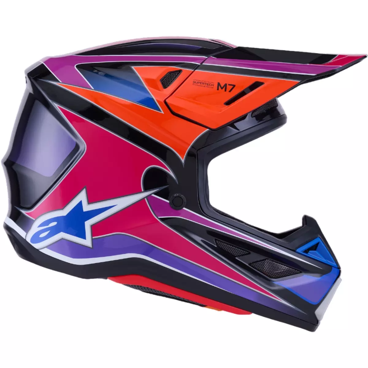 Alpinestars nous propose son casque cross, le Supertech S-M7 Fuse en coloris bleu, violet et rose brillant.
