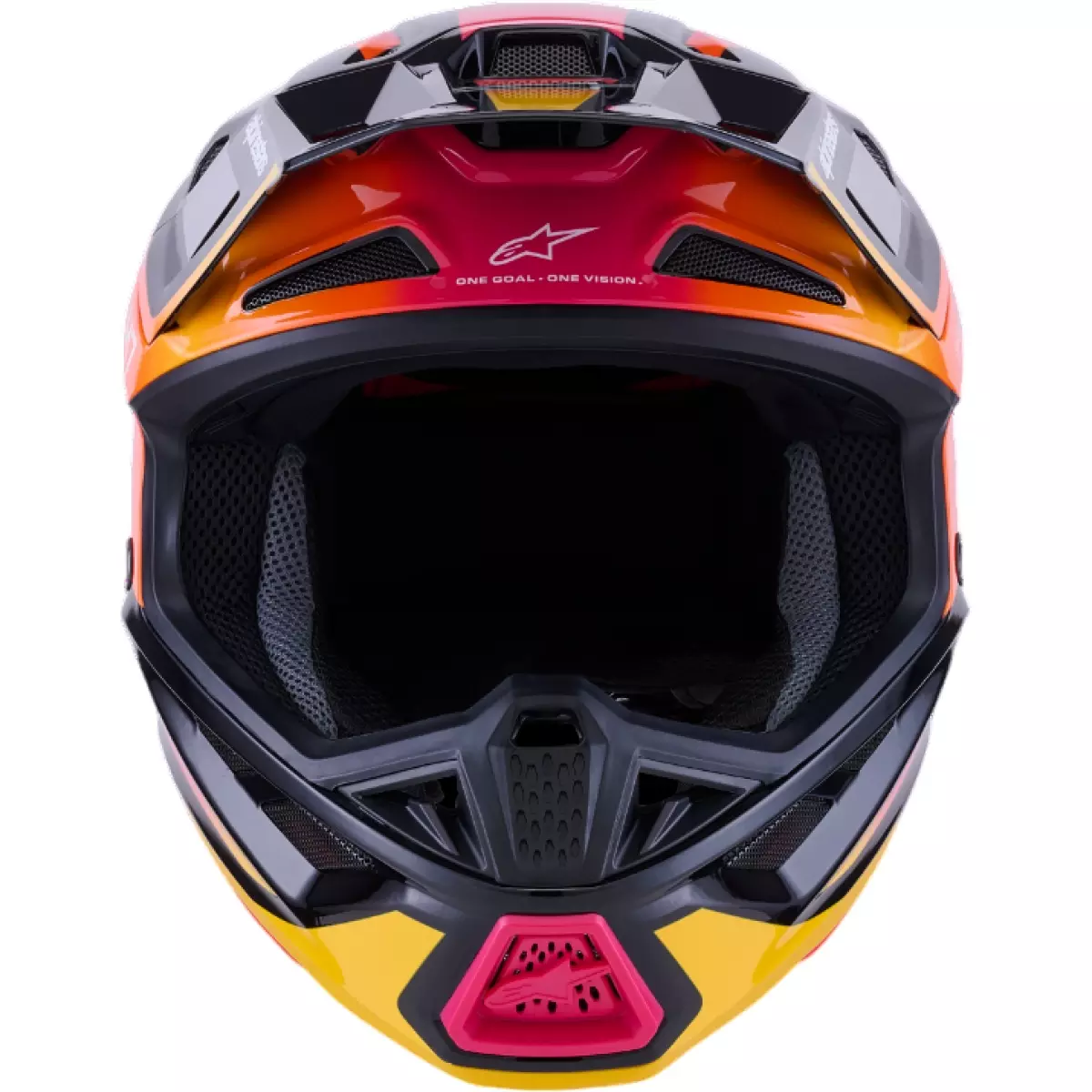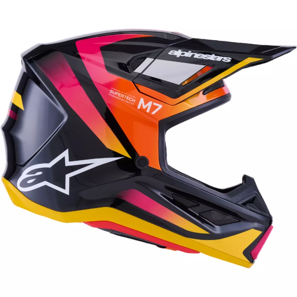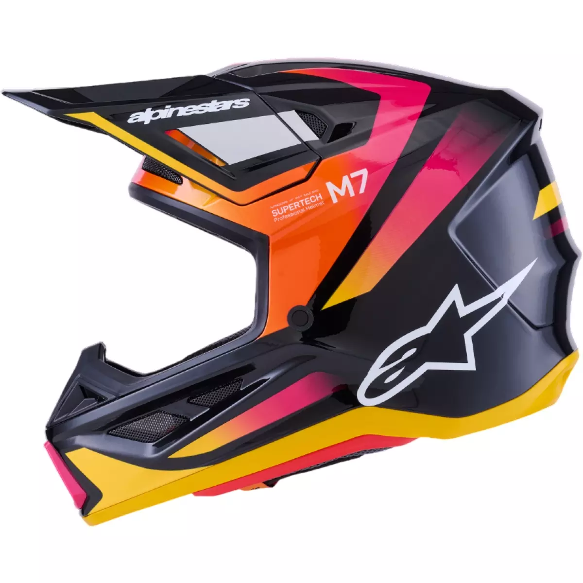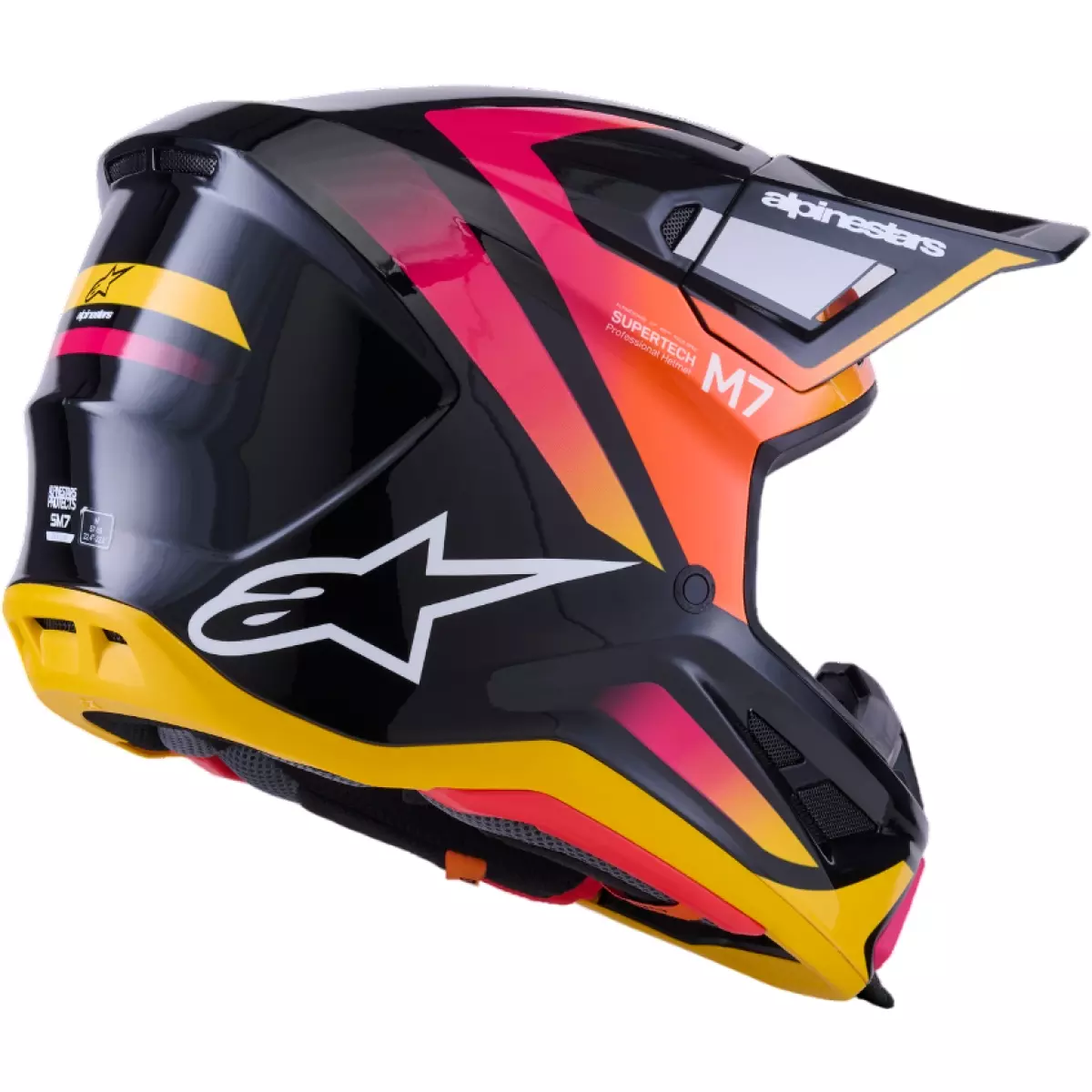 Alpinestars nous propose son casque cross, le Supertech S-M7 Rise en coloris noir, jaune et rose brillant.