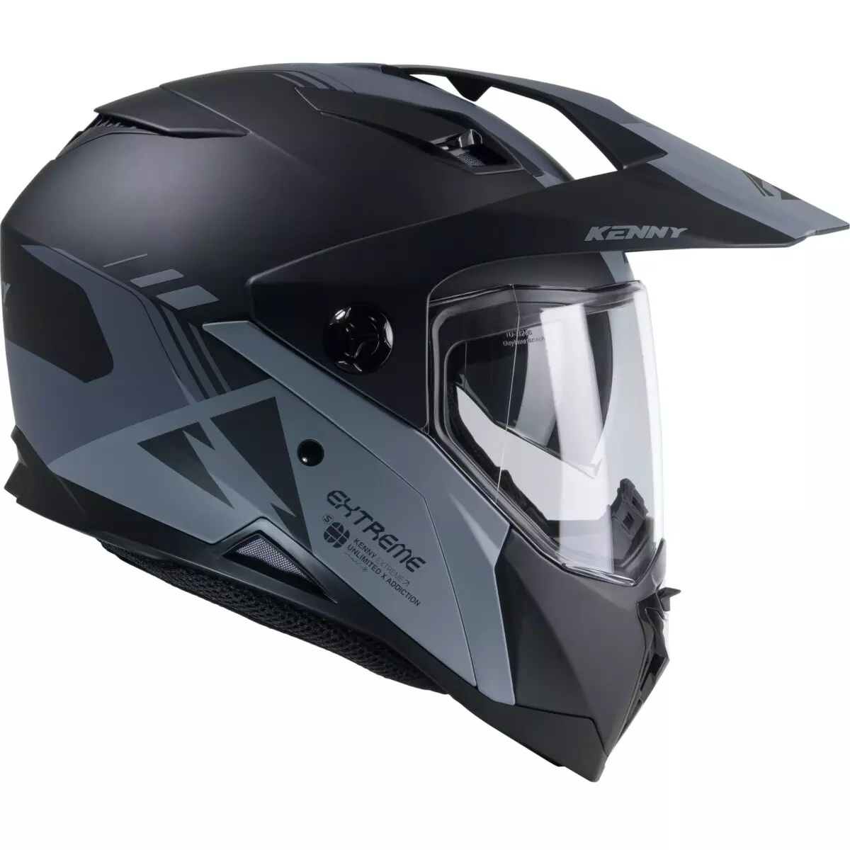 Pensé pour la polyvalence, le Kenny Extreme dispose d’un écran solaire interne escamotable, idéal pour affronter les variations de luminosité. Sa visière incolore est prédisposée à recevoir un film Pinlock (non inclus), afin de limiter la buée en cas de conditions humides ou froides.
