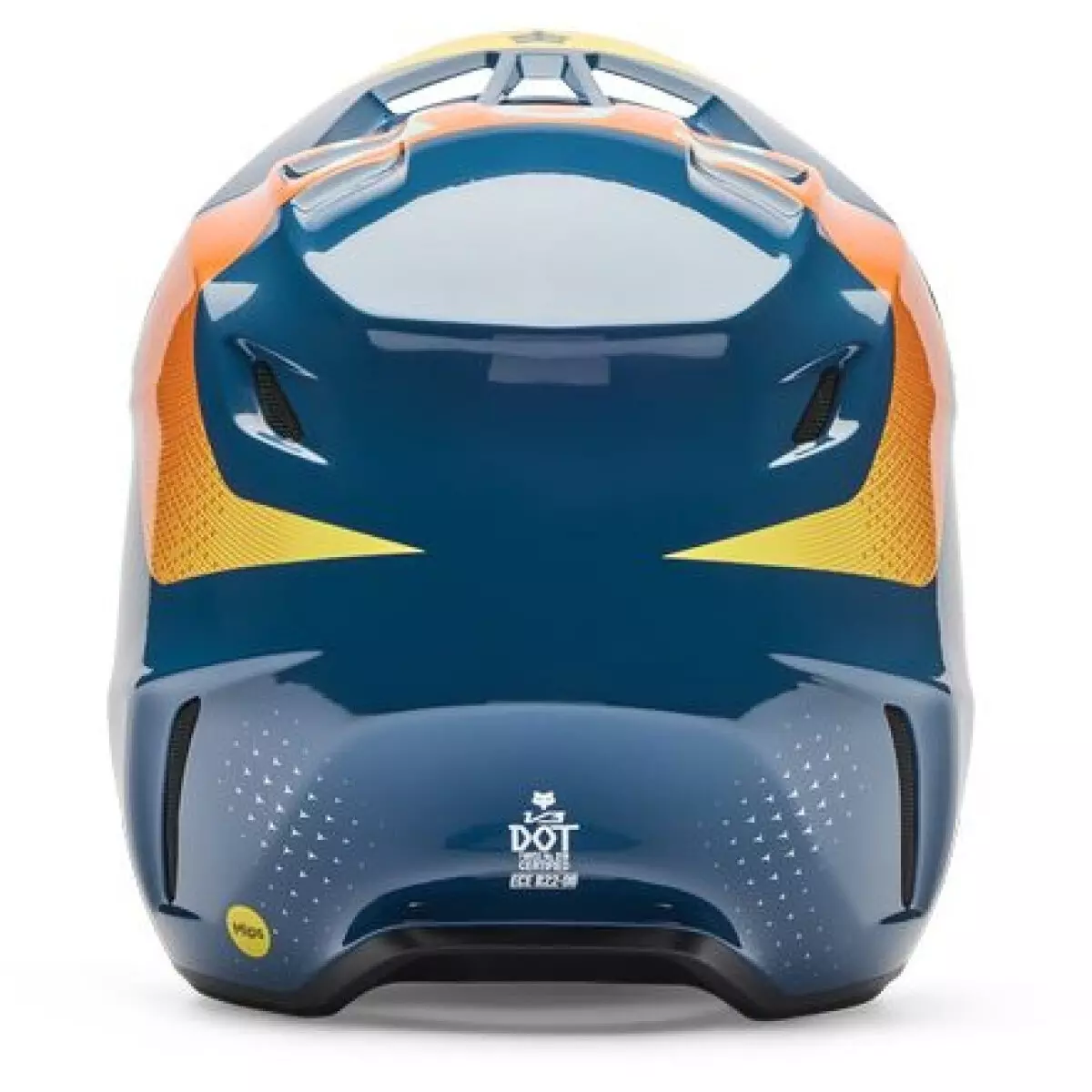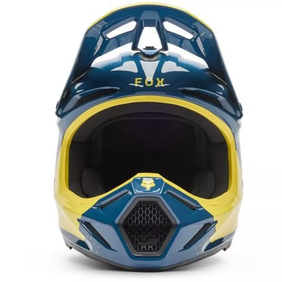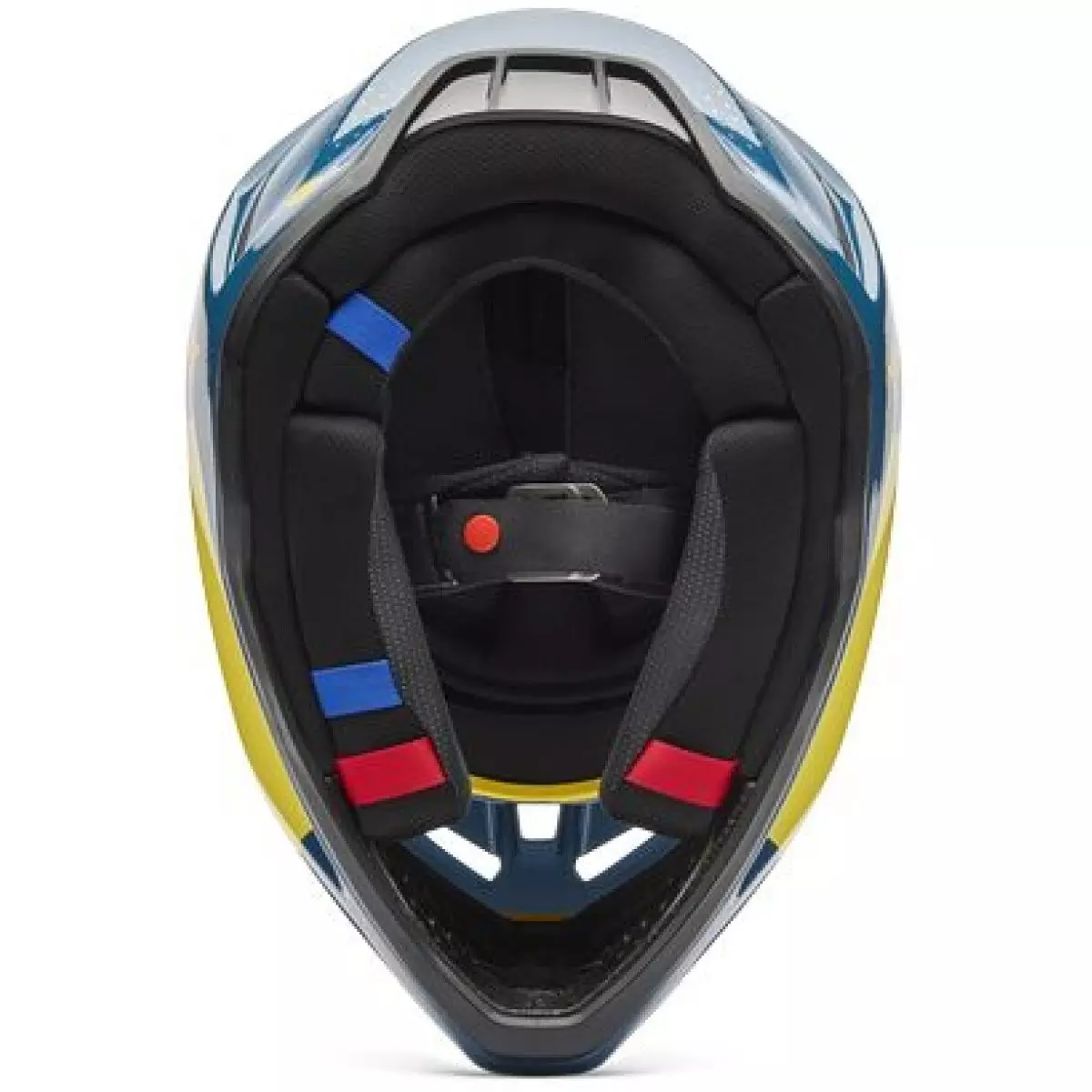 Fox vous présente son casque cross, le V3 Tine en coloris bleu et jaune.