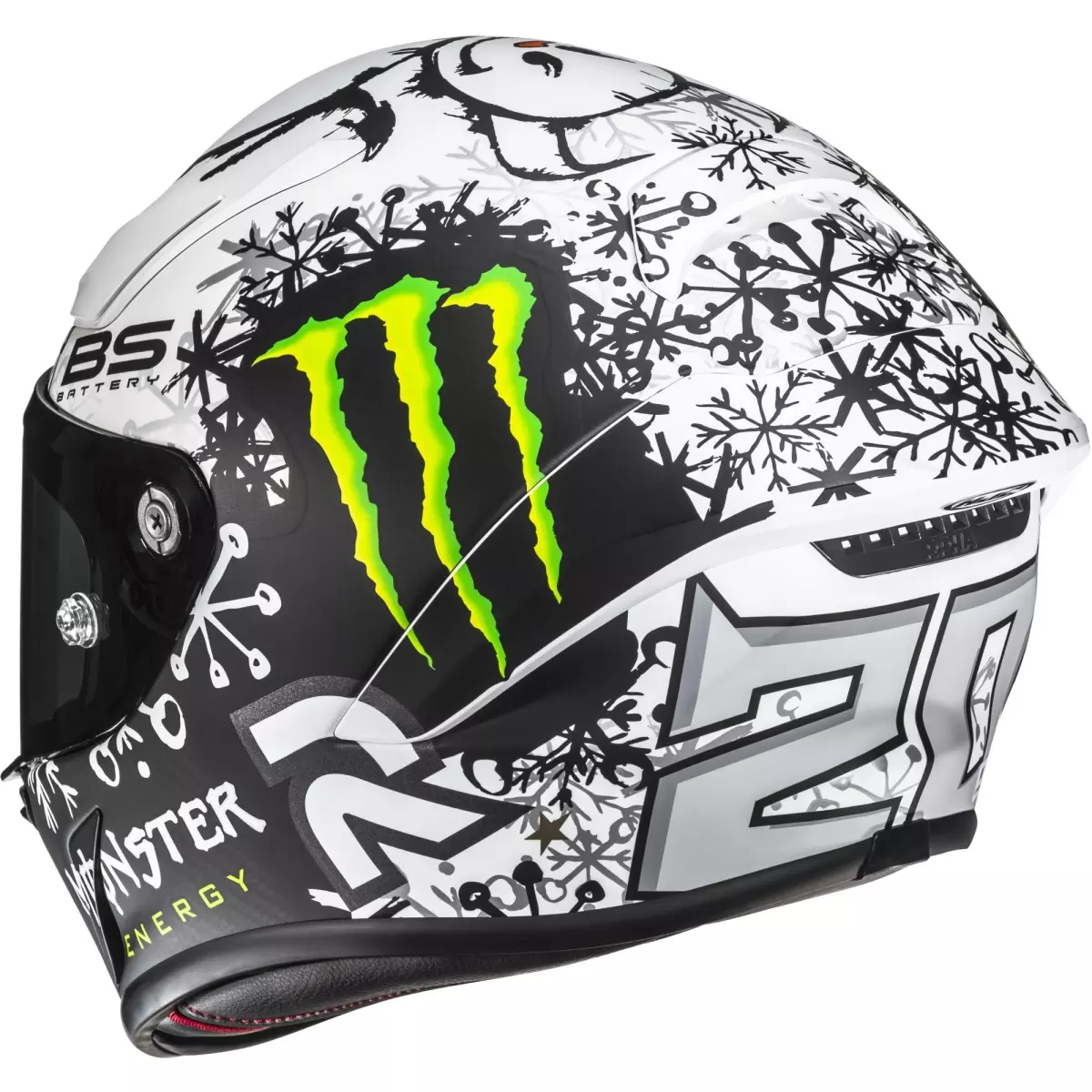 Cette version Snow Diablo arbore un style percutant en noir et blanc, sublimé par les logos Monster Energy et l’iconique “Diablo” revisité sous la forme d’un bonhomme de neige malicieux. Le résultat est un casque à la fois élégant et agressif, qui se démarque par son originalité et sa touche humoristique, tout en restant fidèle à l’univers de Fabio Quartararo.