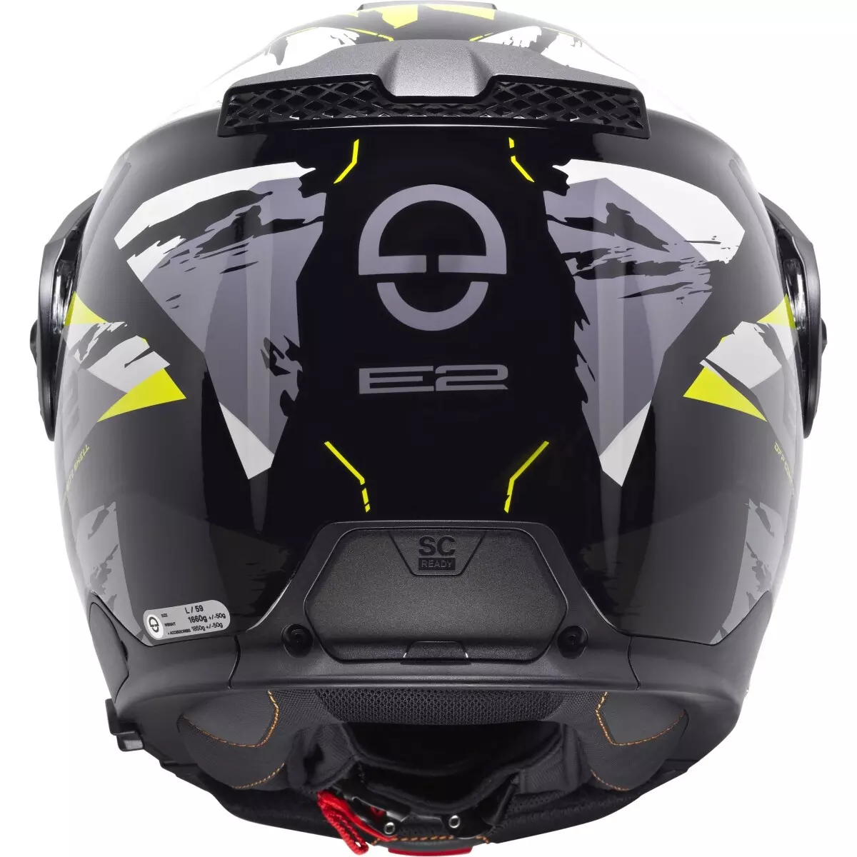 La coque du E2 est réalisée en fibre de verre renforcée par de la fibre de carbone, offrant à la fois légèreté, robustesse et une meilleure absorption des chocs. Il intègre une fermeture micrométrique pratique et sécurisée, ainsi que le système exclusif Anti-Roll-Off, qui, grâce à un nouveau positionnement de la jugulaire, améliore non seulement la sécurité mais aussi le confort au niveau de la gorge.