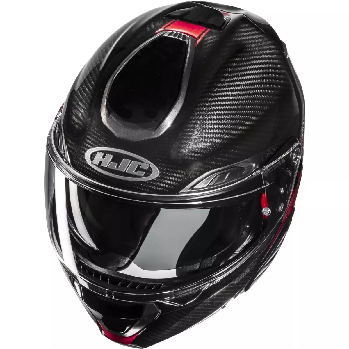 HJC présente son casque modulable RPHA 91 Carbon Elig MC1 en coloris noir et rouge brillant.