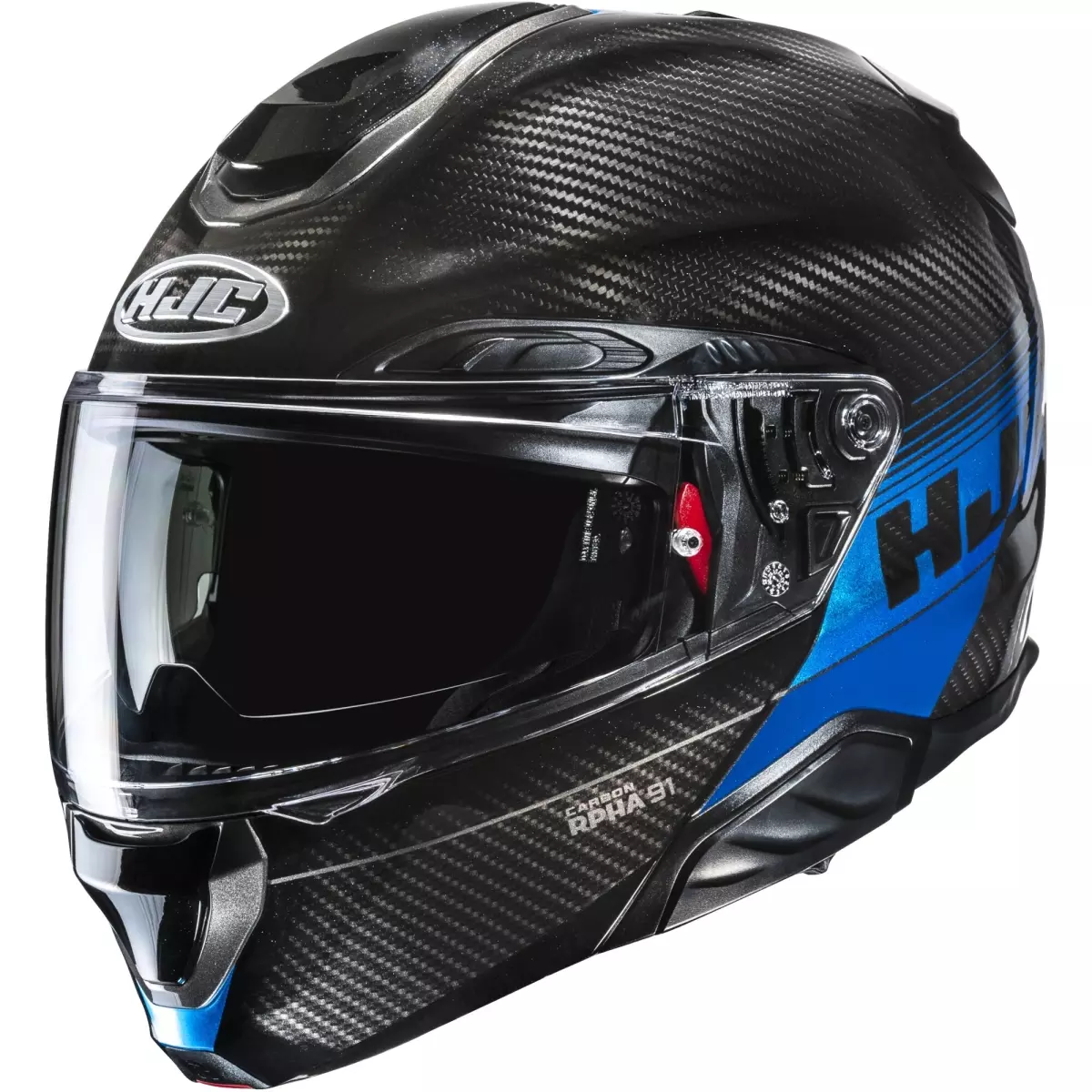 HJC présente son casque modulable RPHA 91 Carbon Elig MC2 en coloris noir et bleu brillant.