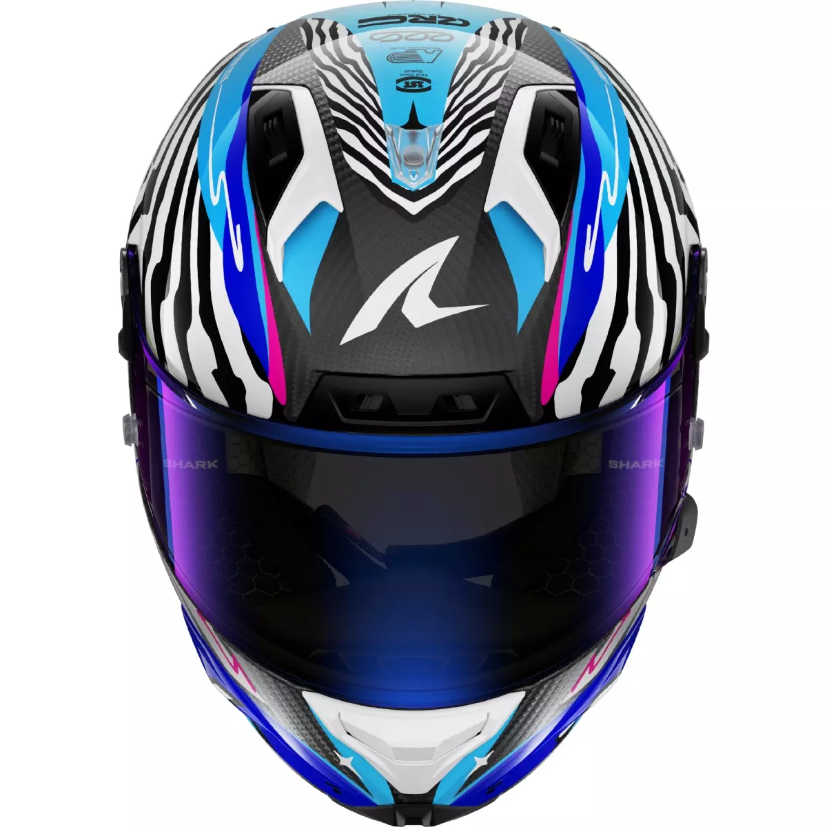 Shark nous propose son casque racing, le Aeron Speed-Fancy Carbone en coloris blanc et bleu brillant.