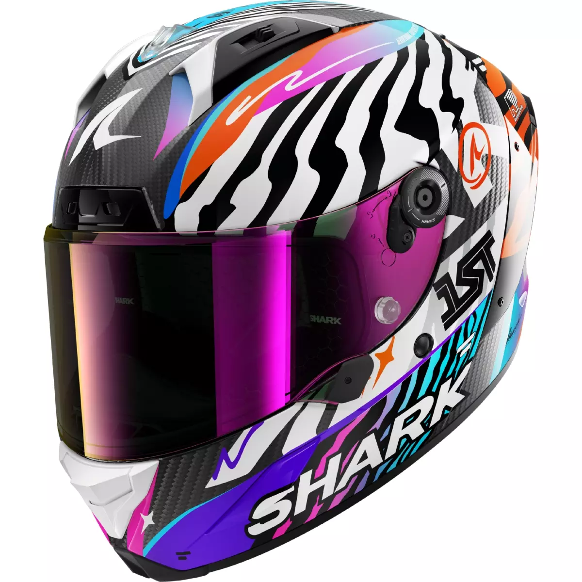 Shark nous propose son casque racing, le Aeron Speed-Fancy Carbone en coloris blanc et orange brillant.