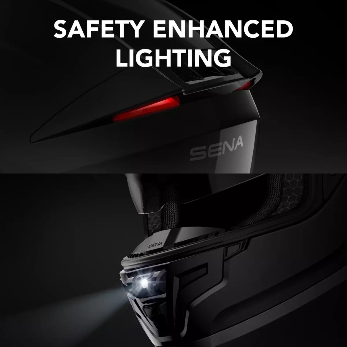 Pensé pour la sécurité active, le casque intègre une lampe frontale discrètement logée dans la mentonnière, ainsi que des feux arrière de position et de freinage, améliorant considérablement la visibilité du pilote. Sa coque en fibre de verre composite, associée à un calotin EPS multi-densité, garantit une absorption optimale des chocs, tandis que la fermeture par boucle double-D assure un maintien fiable et précis.
