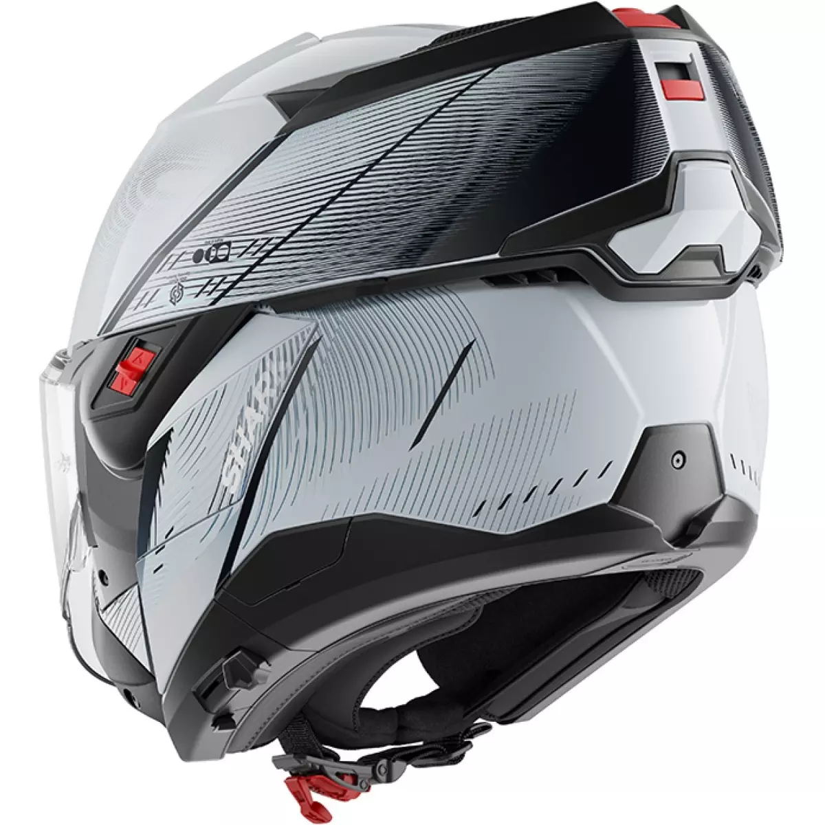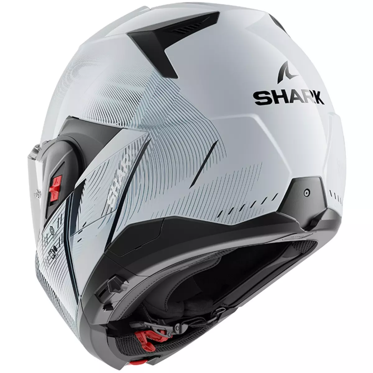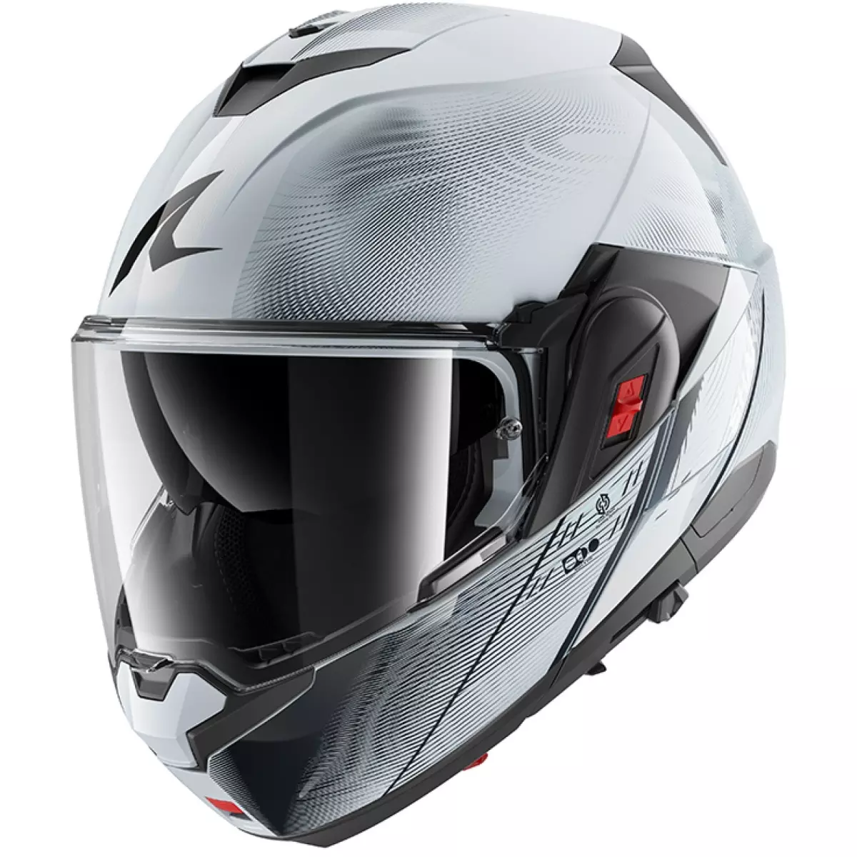 Shark vous présente son casque, le Oxo Speed-Tech en coloris argent, blanc et noir brillant.