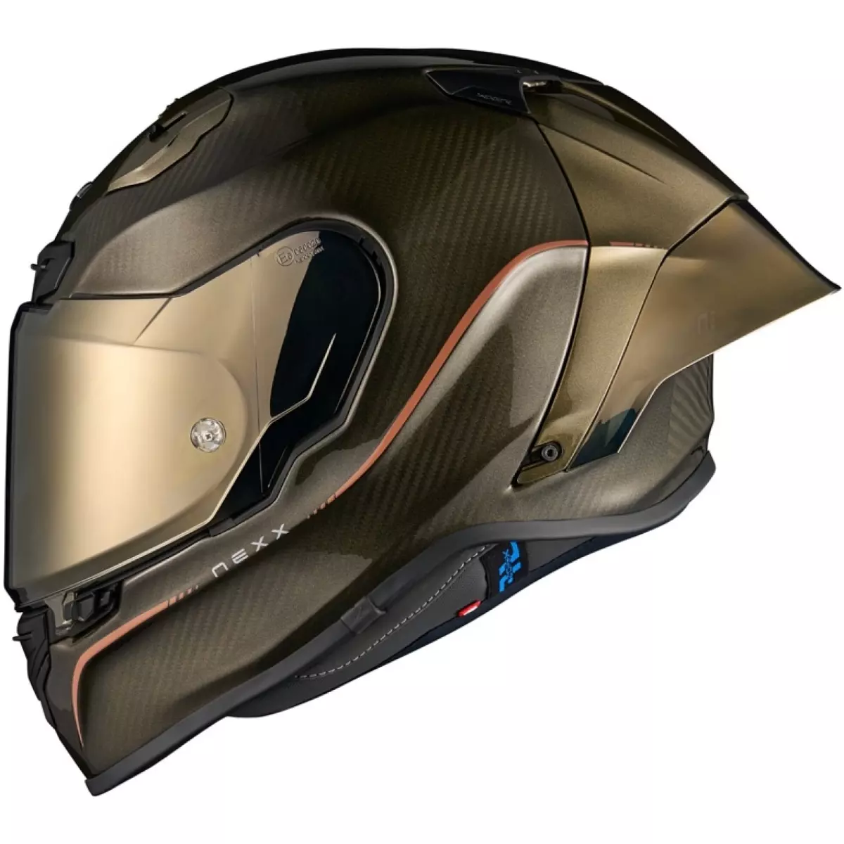 Nexx vous présente son casque moto racing intégral, le X.R3R Hagibis en coloris or.