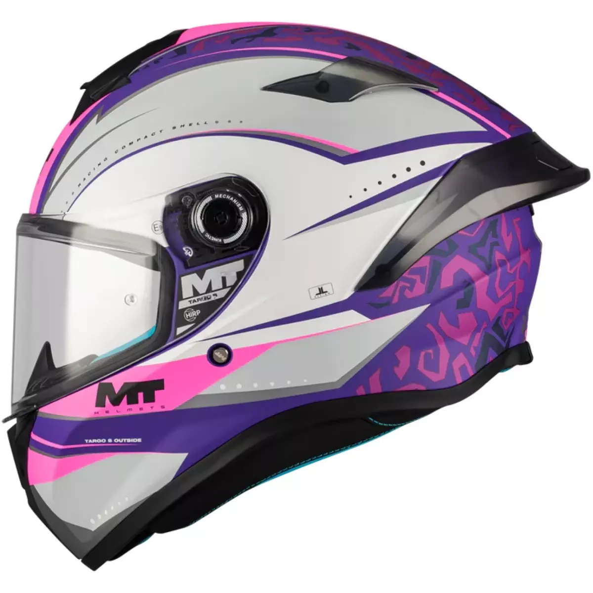 MT Helmets vous propose son casque moto intégral, le Targo S Outside C8 en coloris violet, blanc, rose.