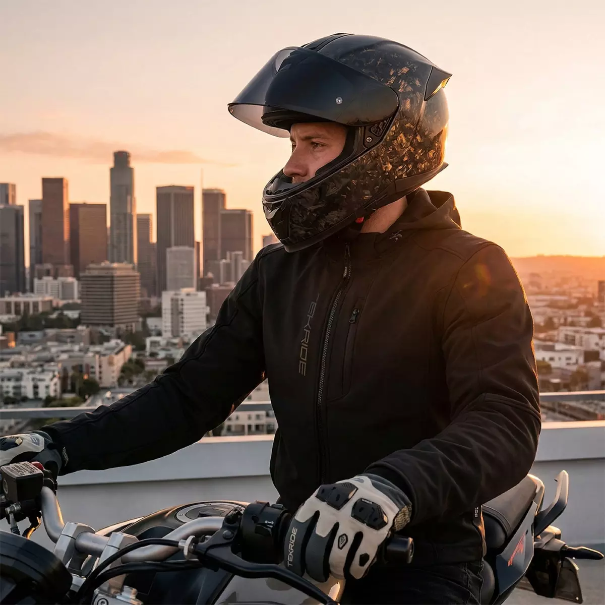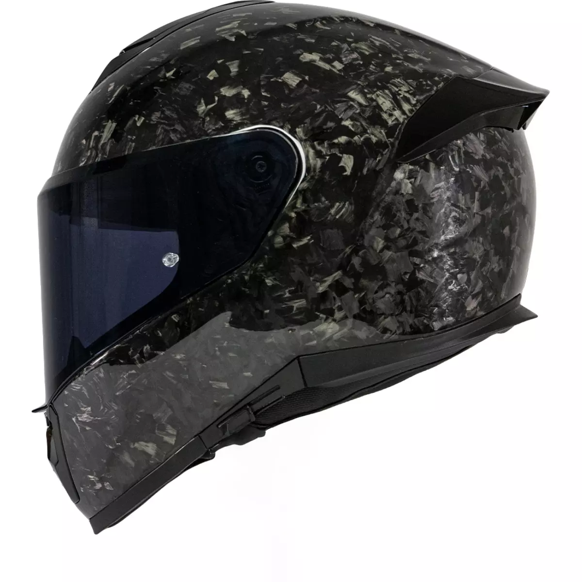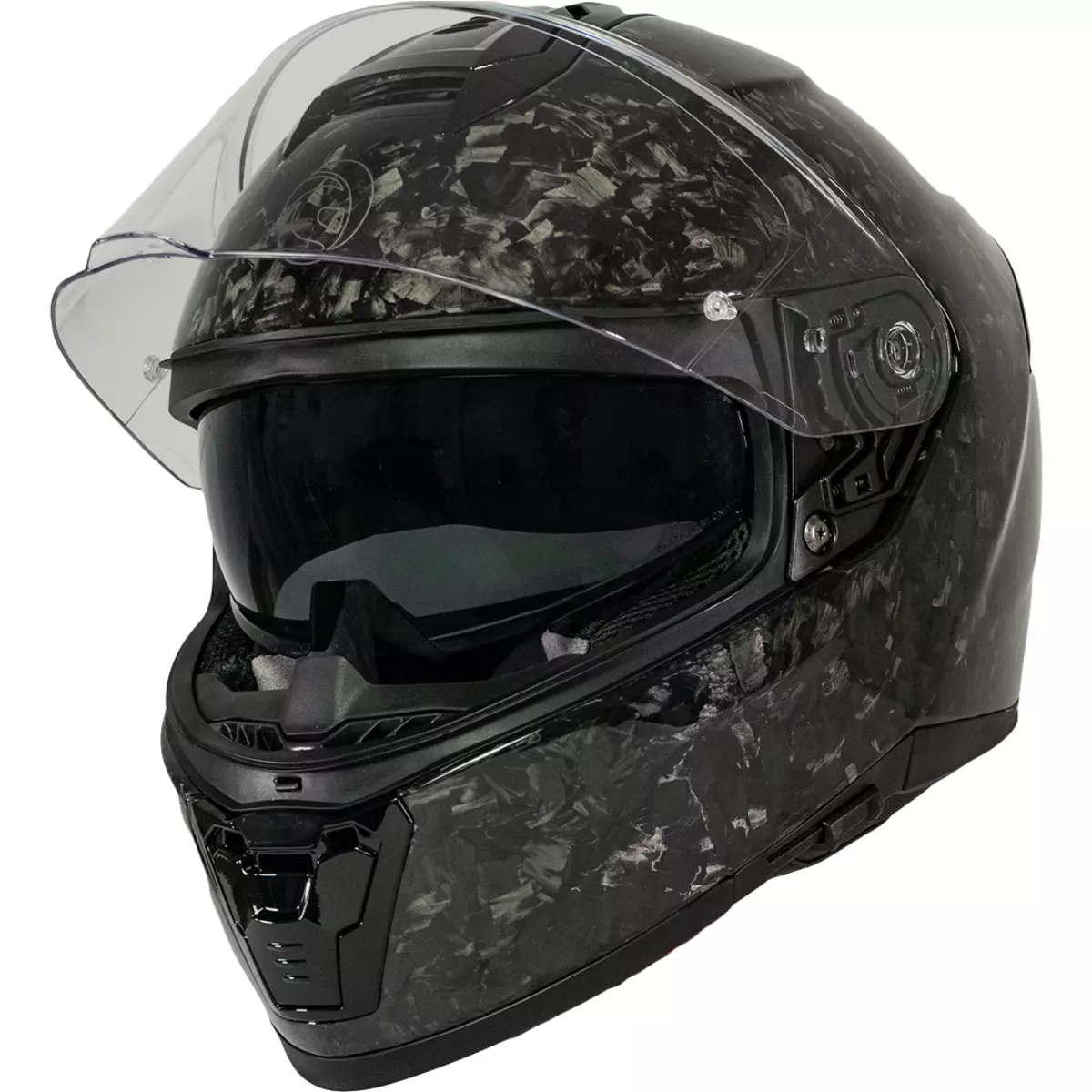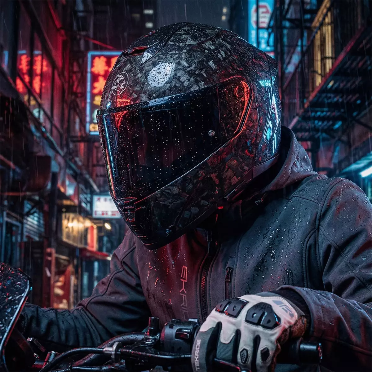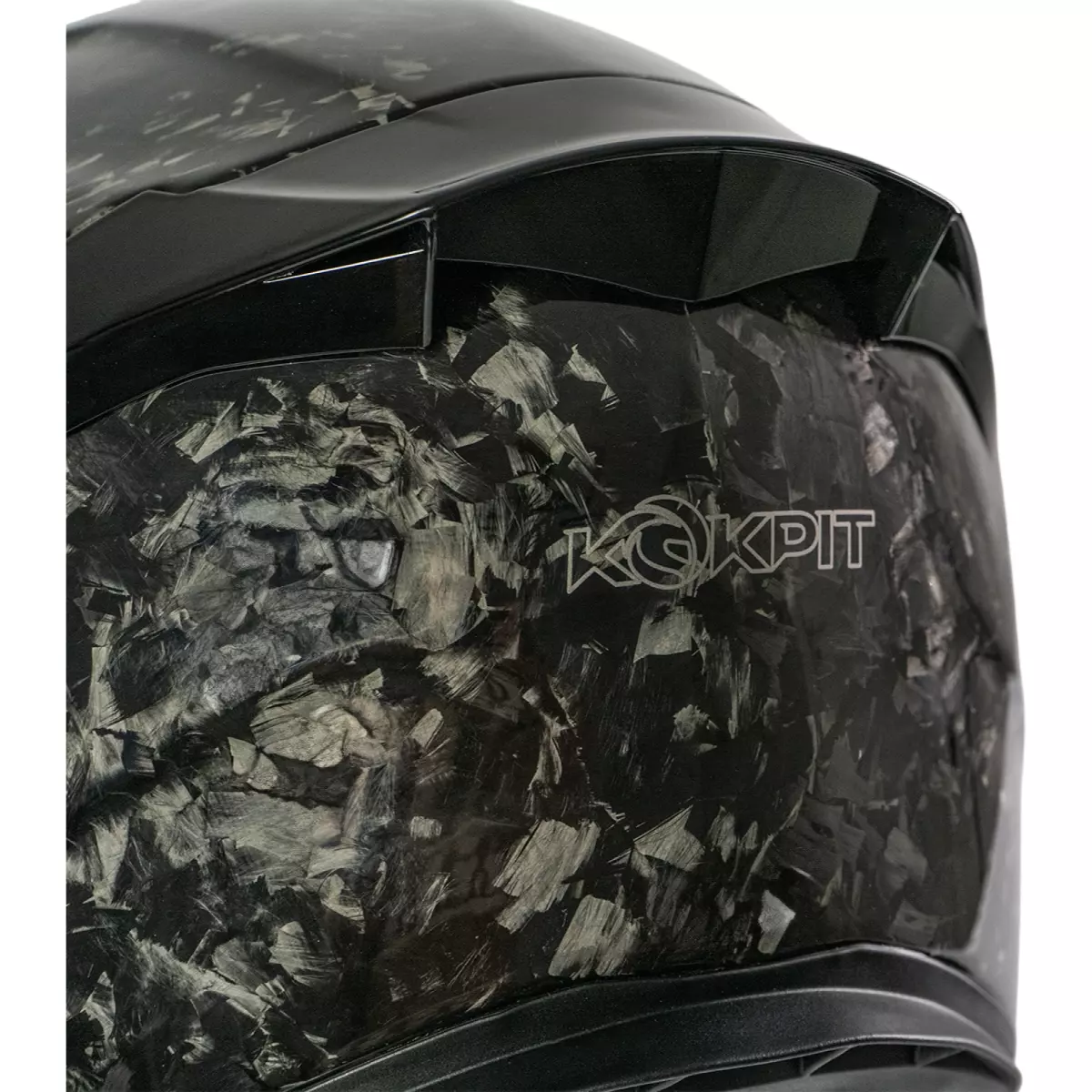 Le Kokpit K-916 Carbone Forgé se distingue immédiatement par sa finition en carbone haché, dont le tressage aléatoire crée un rendu visuel unique : chaque casque présente ainsi un motif différent. Ce casque, disponible uniquement chez Speedway, associe esthétique distinctive et conception technique légère.