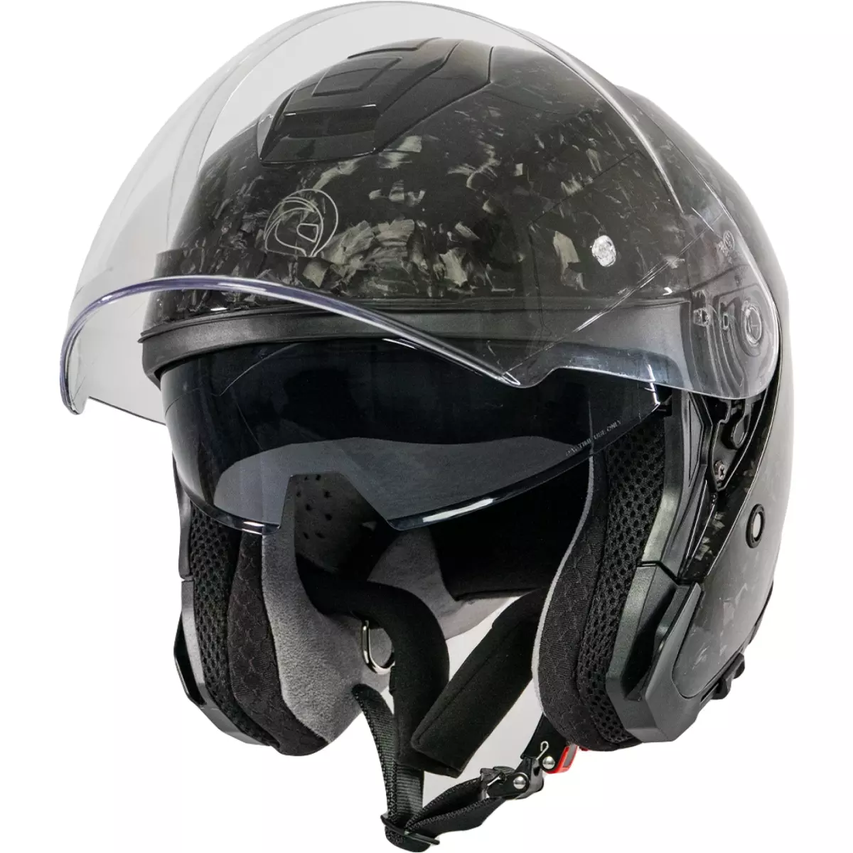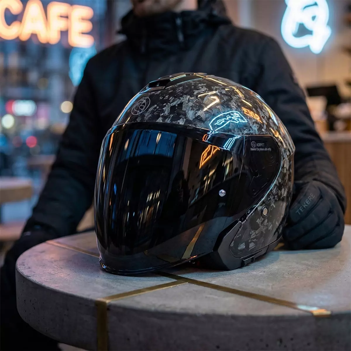 Kokpit vous présente son casque moto jet, le K-916 Carbone Forgé en coloris noir brillant.