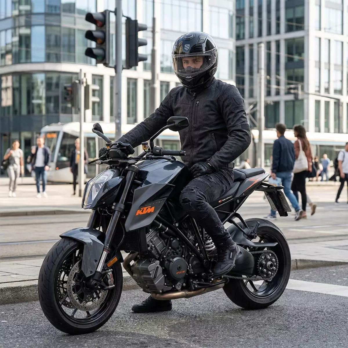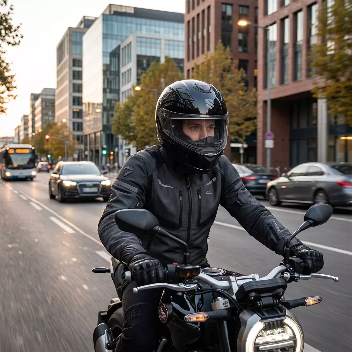 La coque en polycarbonate offre protection et poids contenu. Conforme à la norme ECE 22.06, il reçoit une fermeture par boucle micrométrique permettant un ajustement précis et rapide. Des inserts réfléchissants intégrés au niveau des mousses de nuque améliorent la visibilité du pilote en conditions nocturnes ou de faible luminosité.