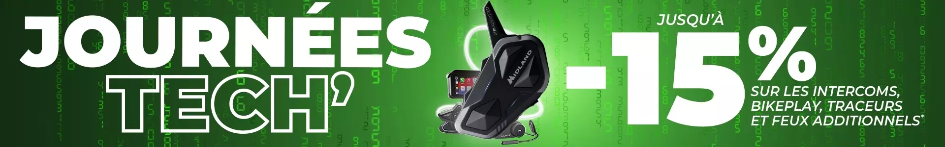 Durant les journées Tech’ profitez de remises exclusives - Du 04/06 au 18/06 - 9h, sur une large sélection d’intercom solo, duo, traceur GPS sur les marques MIDLAND, SENA, CARDO, GARMIN, ELY’TEK