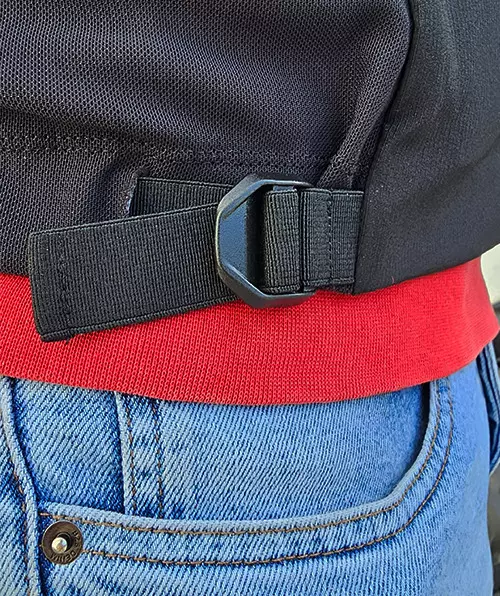 Le gilet est ajustable au niveau des hanches grâce à un système de sangles que l’on règle soi-même, afin de s’adapter à différentes morphologies. Le tissu sur côté du gilet est différent, encore plus extensible pour que le confort soit maximal lorsque vous êtes assis sur la selle.